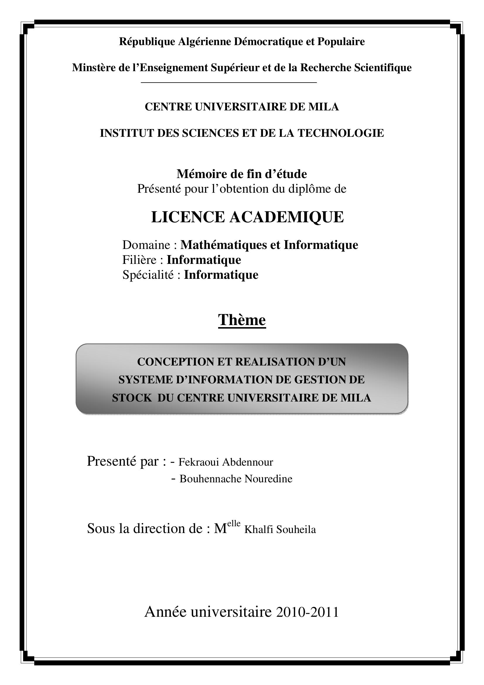 Fekraoui Abdennour & Khalfi Souheila( encadreur) (2011). Conception et realisation d'un systeme d'information de gestion de stock du centre universitaire de mila.