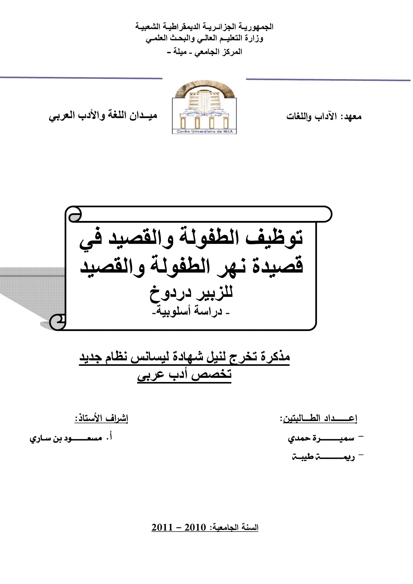 سميرة حمدي et al. (2011). توظيف الطفولة و الشعر في قصيدة نهر الطفولة و القصيد للزبير دردوخ-دراسة أسلوبية-.