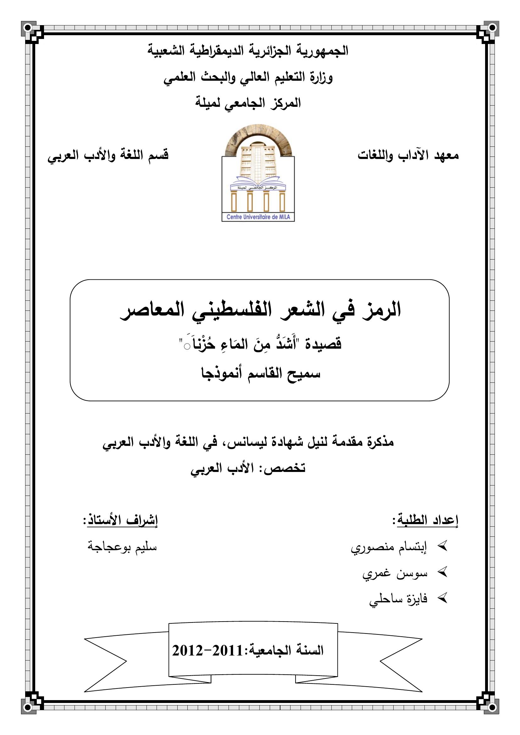 إبتسام منصوري et al. (2012). الرمز في الشعر الفلسطيني المعاصر قصيدة ''اشد من الماء حزنا ''سميح القاسم.