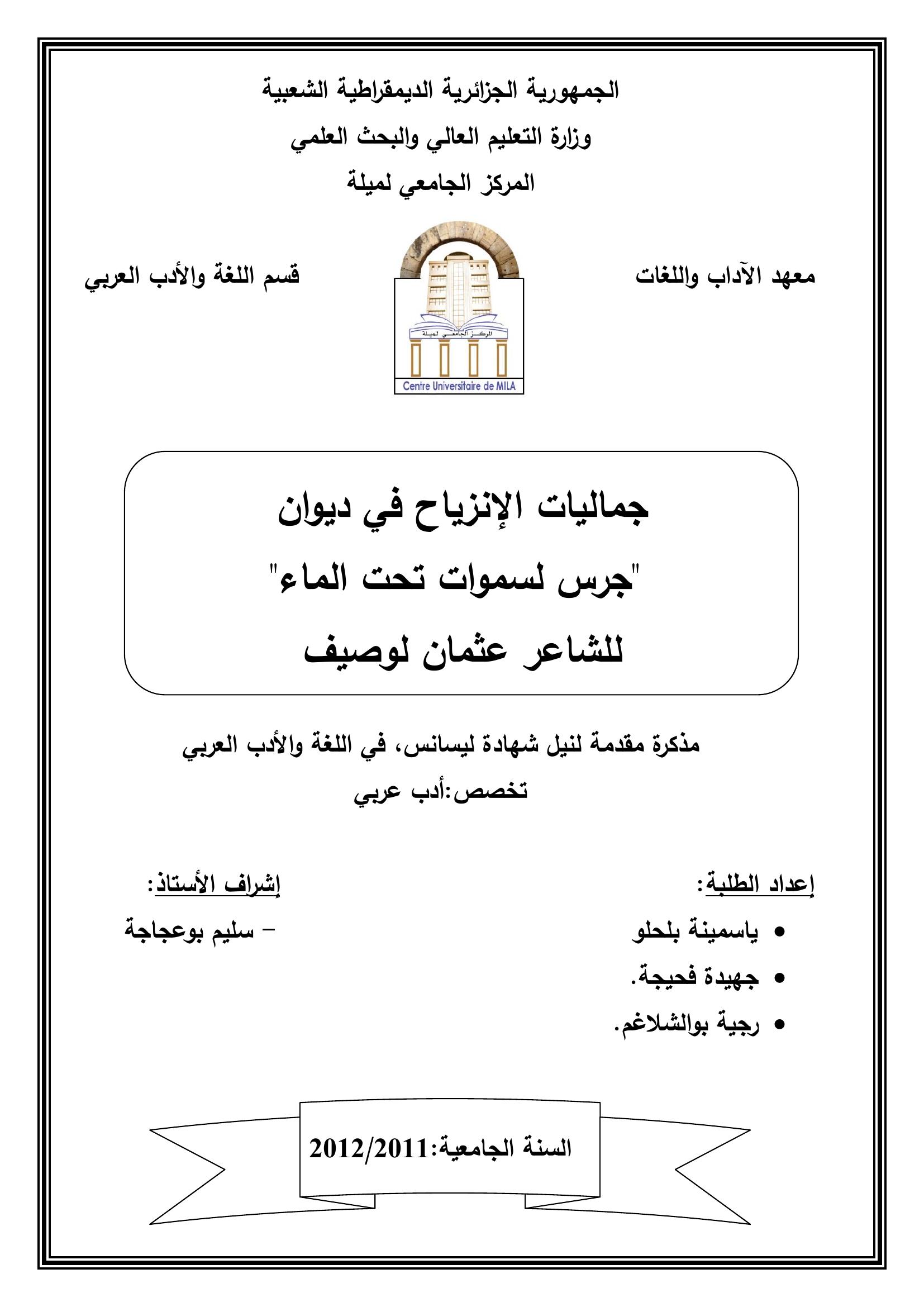 ياسمينة بلحلو & بوعجاجة سليم (مشرفا) (2012). جماليات الإنزياح في ديوان ''جرس لسموات تحت الماء ''للشاعر عثمان لوصيف.