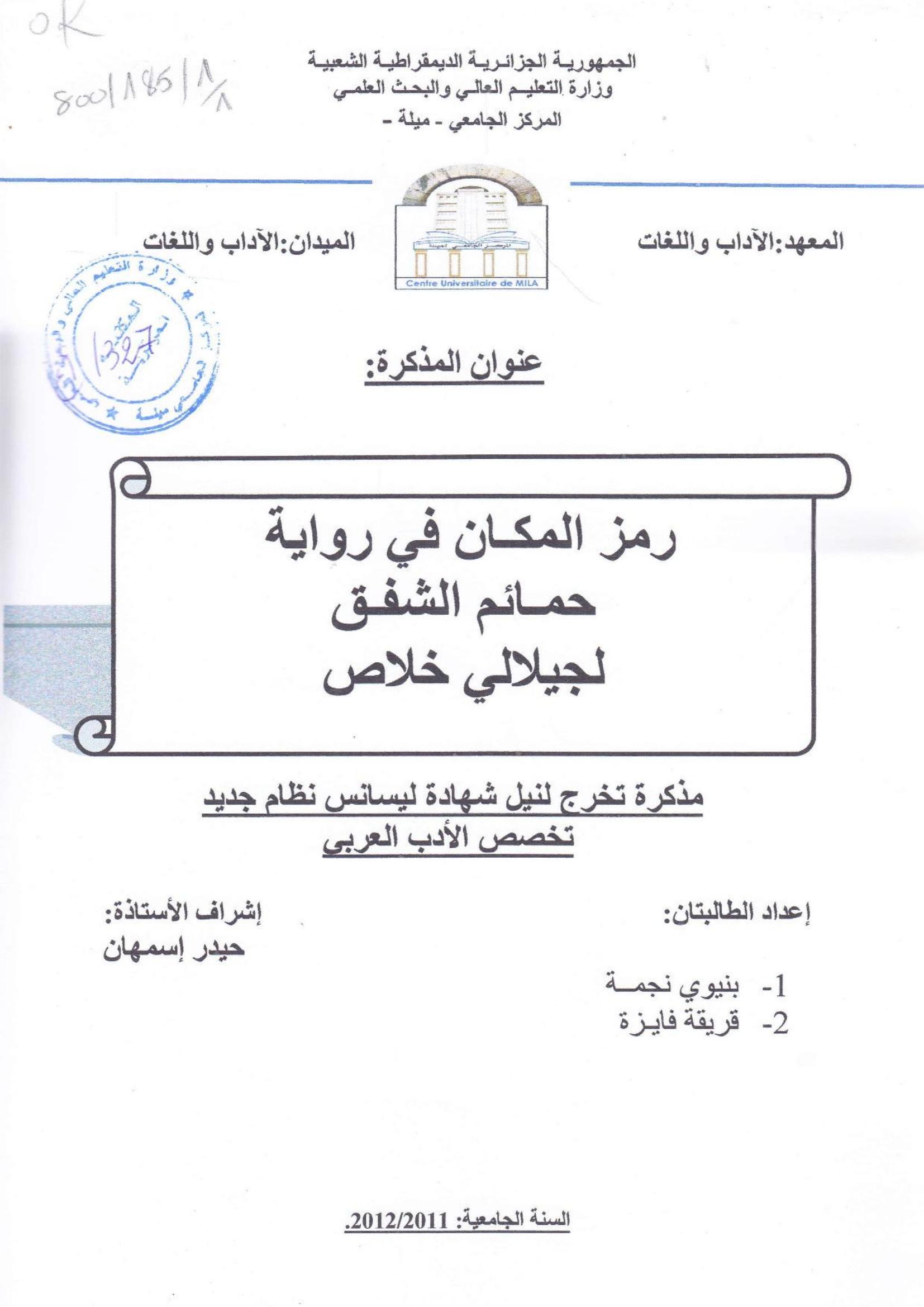 بنيوي نجمة et al. (2012). رمز المكان في رواية حمائم الشفق لجيلالي خلاص.