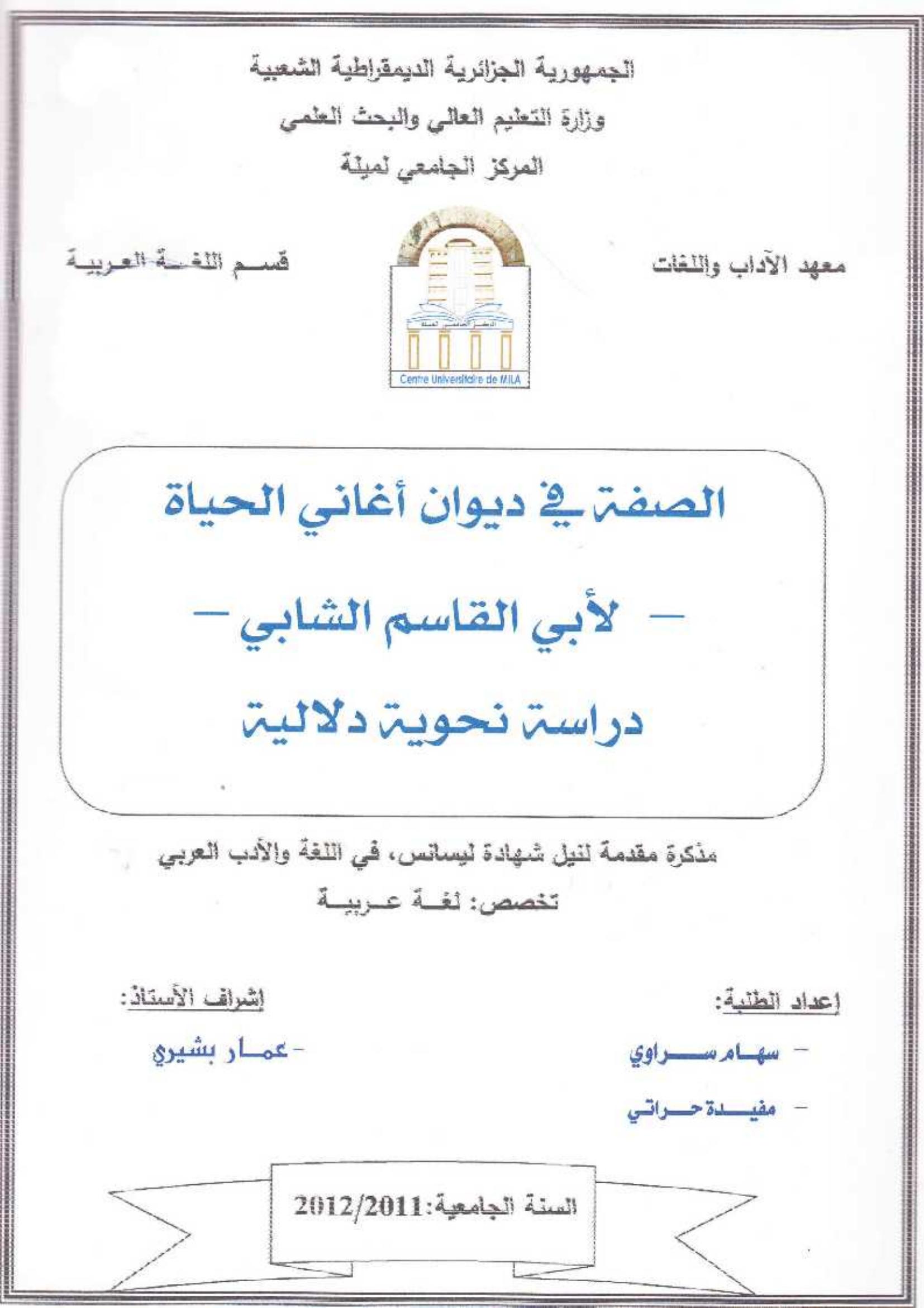 سهام سراوي et al. (2012). الصفة في ديوان أغاني الحياة -لأبي القاسم الشابي -دراسة نحوية دلالية.