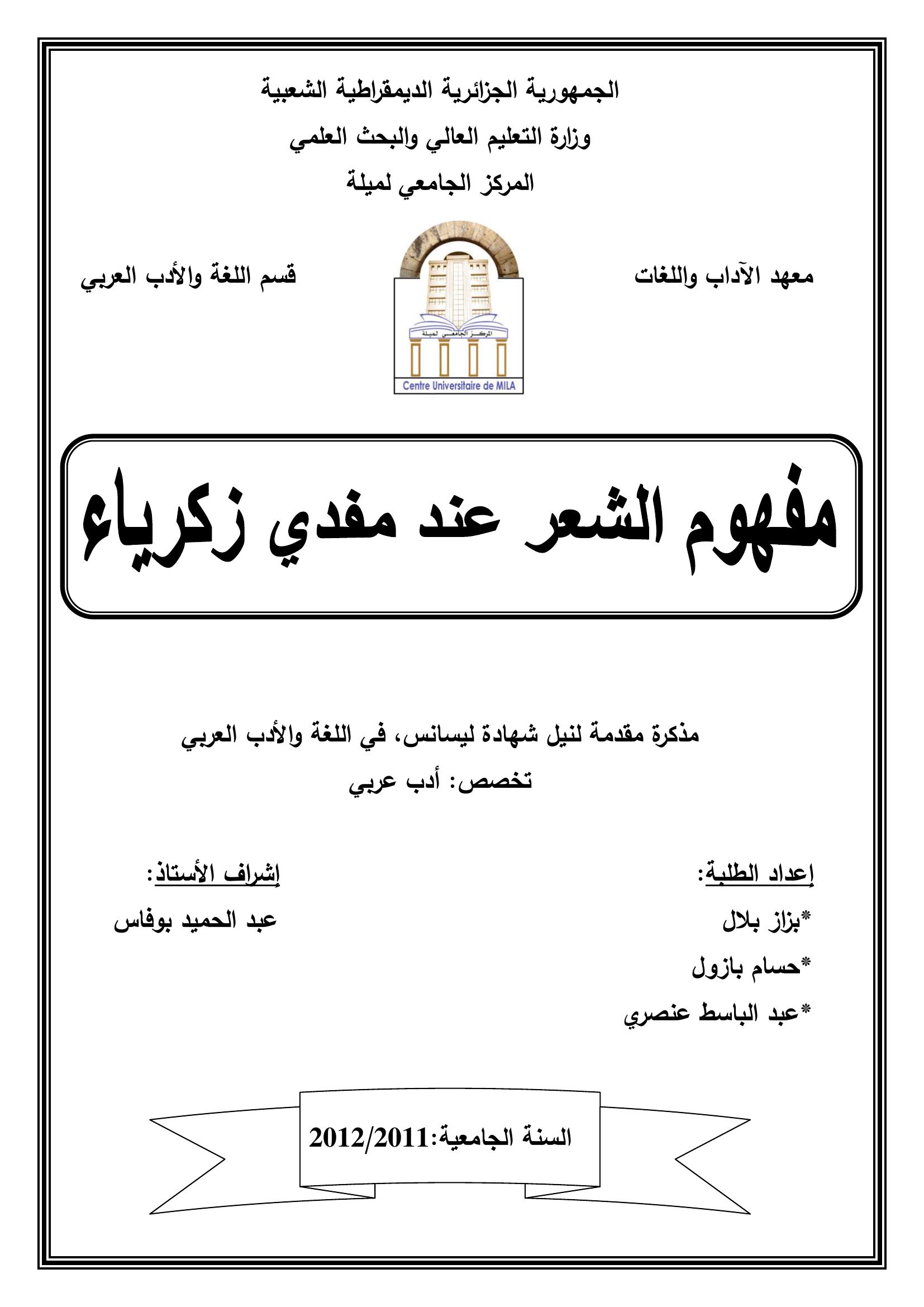 بزاز بلال et al. (2012). مفهوم الشعر عند مفدي زكريا.