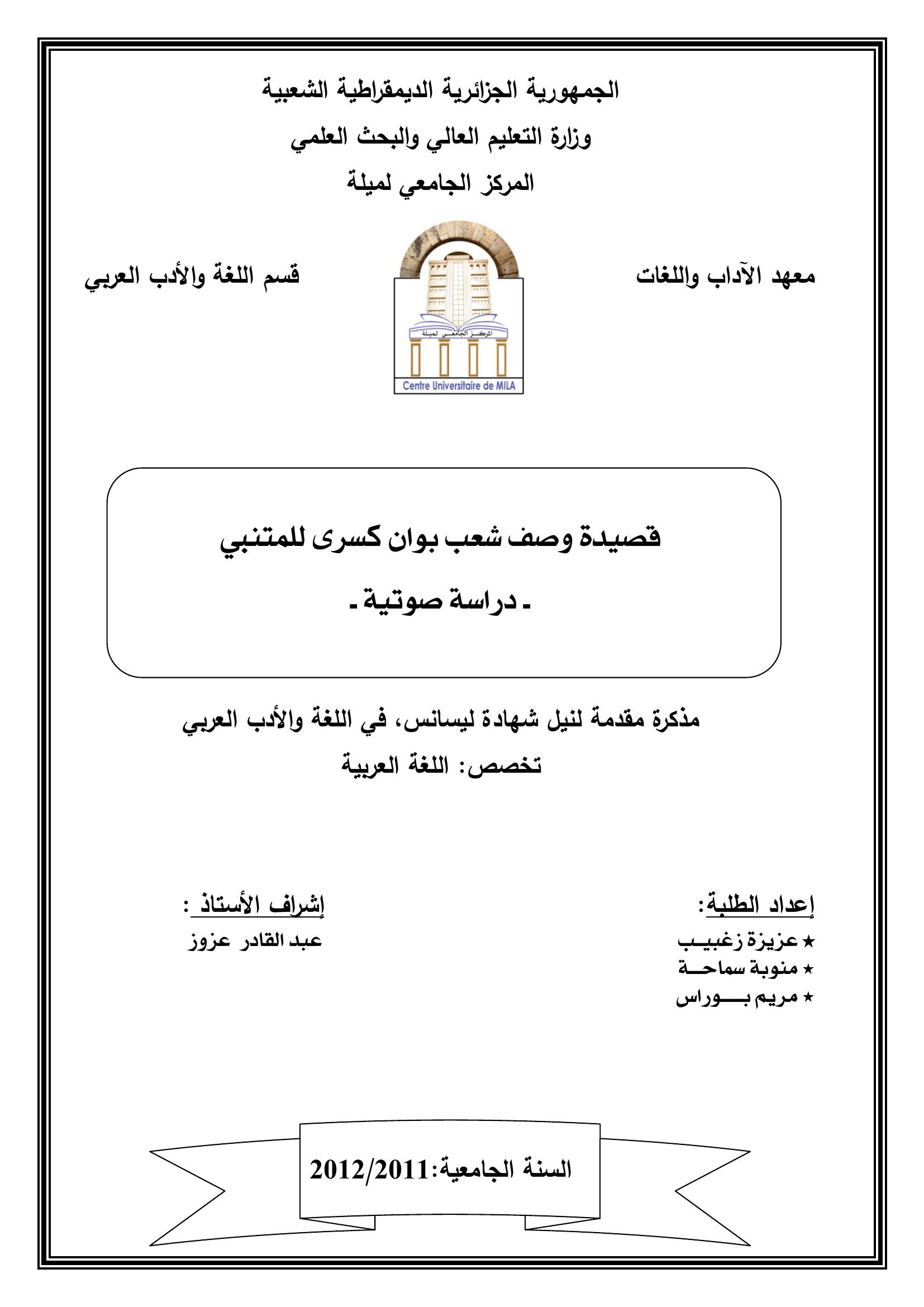 عزيزة زغبيب et al. (2012). قصيدة وصف شعب بوان كسرى للمتنبي -دراسة صوتية -.