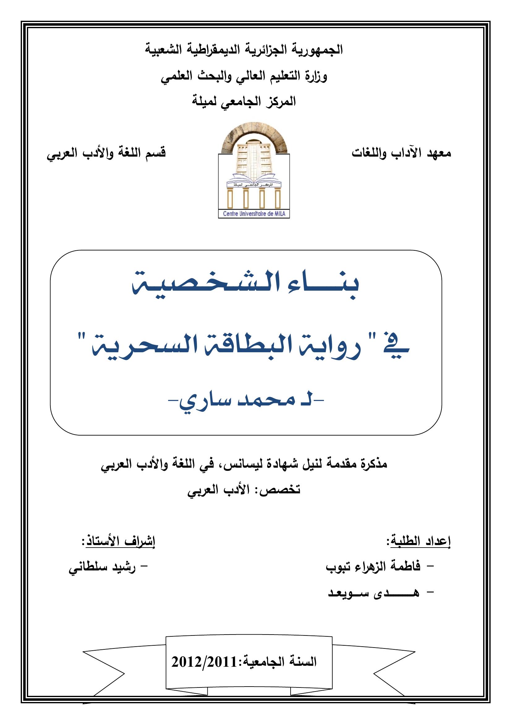 فاطمة الزهراء تبوب et al. (2012). بناء الشخصية في ''رواية البطلقة السحرية -لـ محمد ساري -.