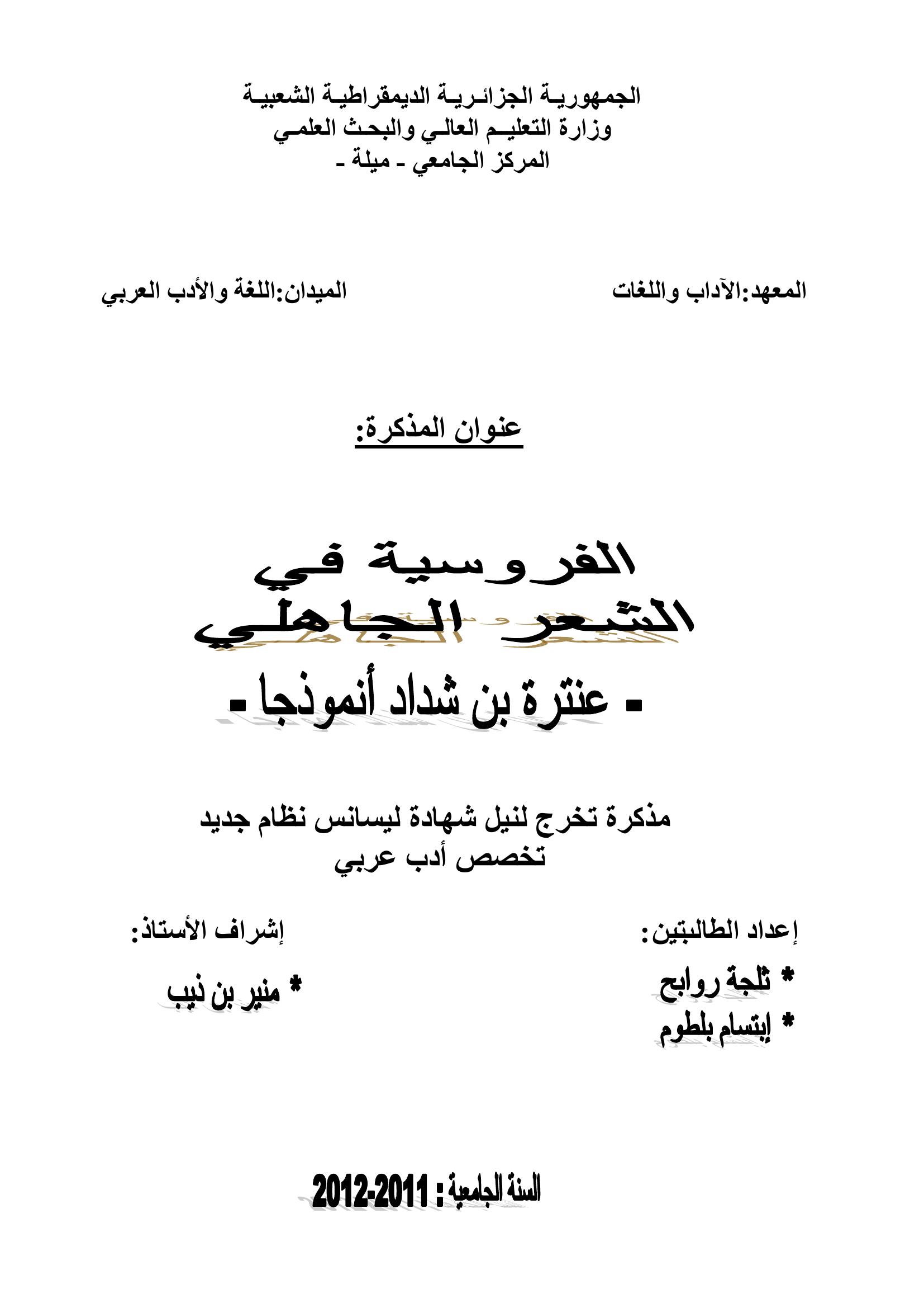 إبتسام بلطوم et al. (2012). الفروسية في الشعر الجاهلي-عنترة بن شداد أنمودجا.