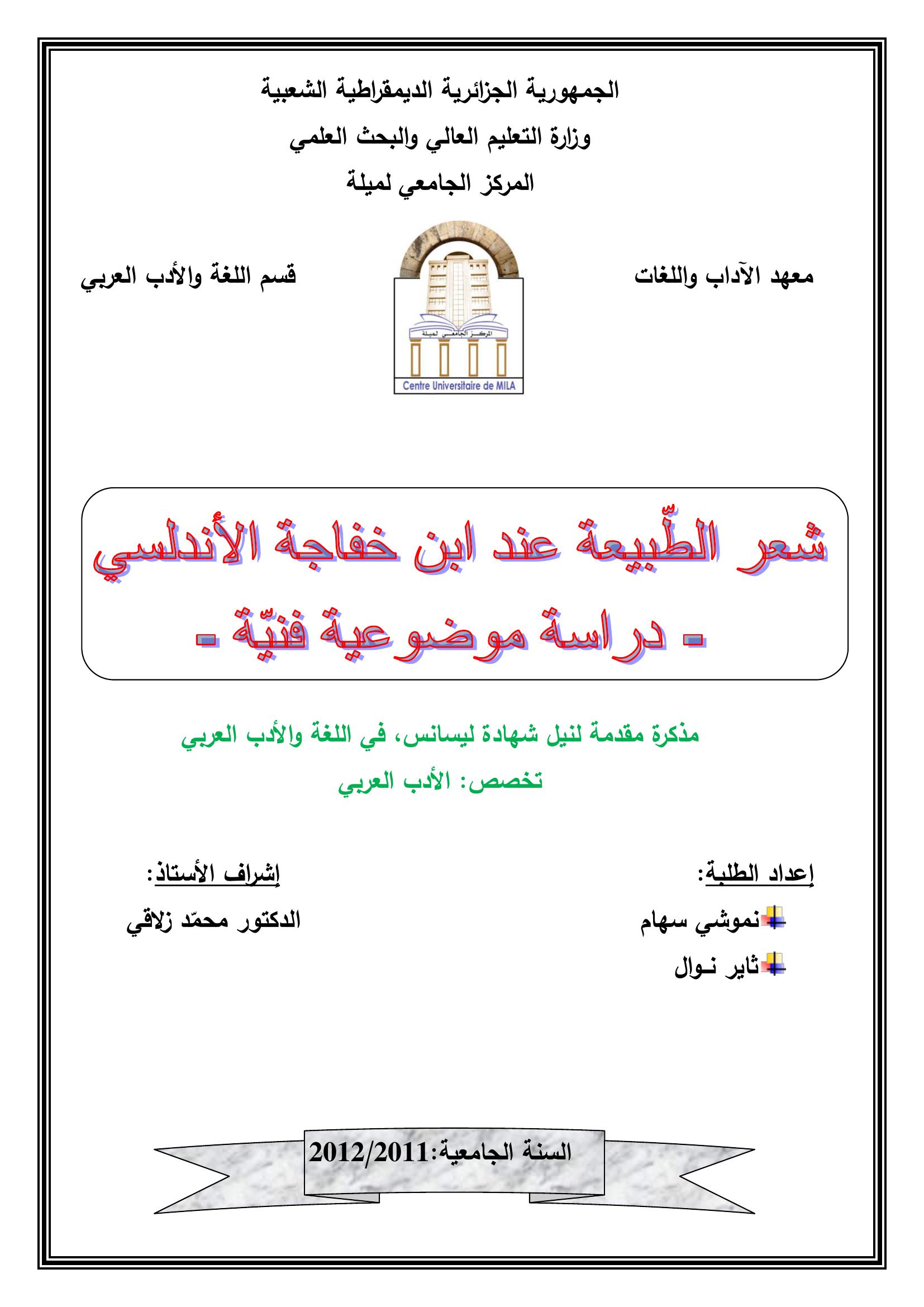 نموشي سهام et al. (2012). شعر الطبيعة عند ابن خفاجة الأندلوسي -دراسة موضوعية فنية -.