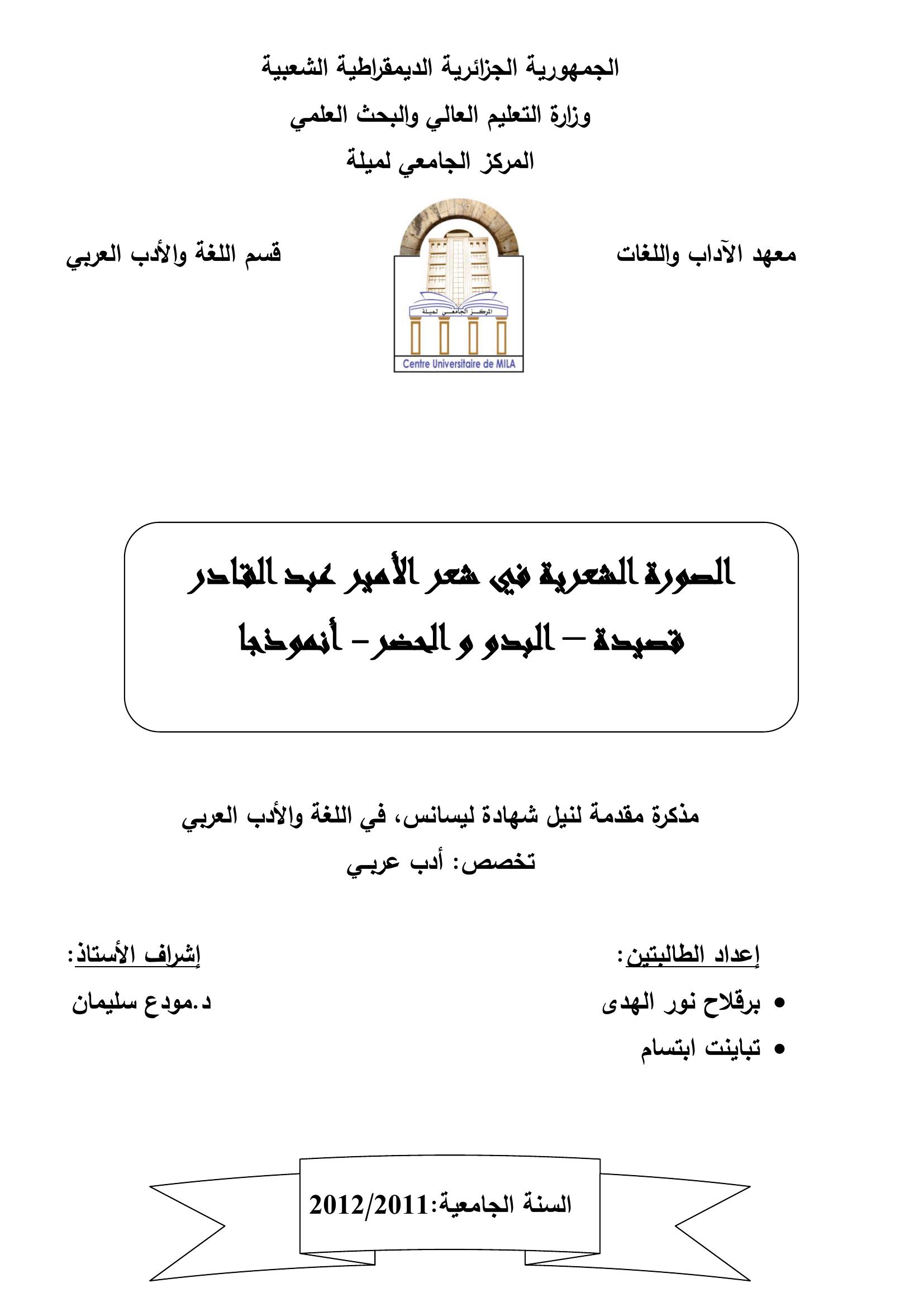 برقلاح نور هدى et al. (2012). الصورة الشعرية في شعر الأمير عبد القادر قصيدة-البدو والحضر-أنمودجا.