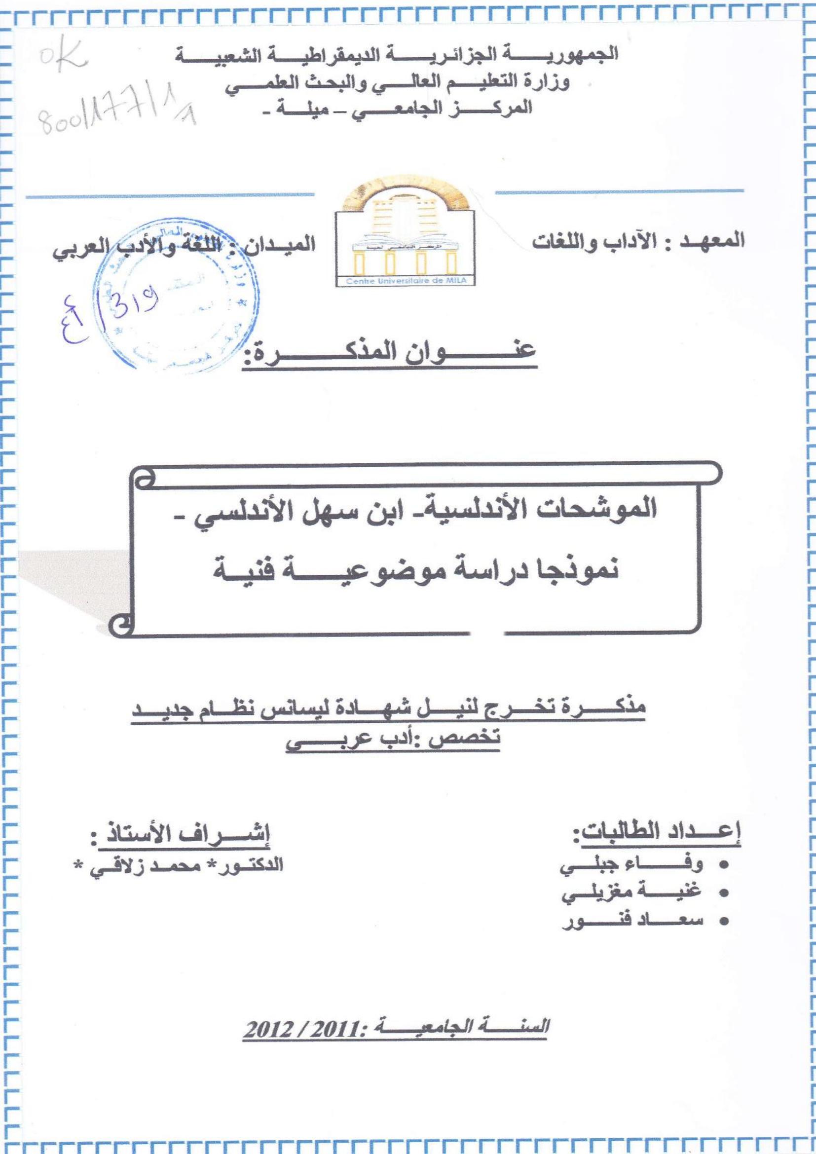 زلاقي محمد( مشرفا) et al. (2012). الموشحات الأندلسية-إبن سهل الأندلسي-نموذجا لدراسة موضوعية فنية.
