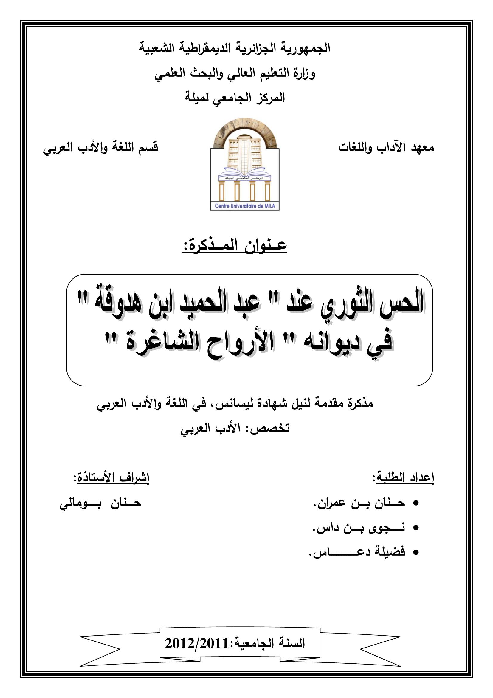 حنان بن عمران et al. (2012). الحس الثوري عند ''عبد الحميد بن هدوقة''في ديوانه ''الأرواح الشاغرة''.