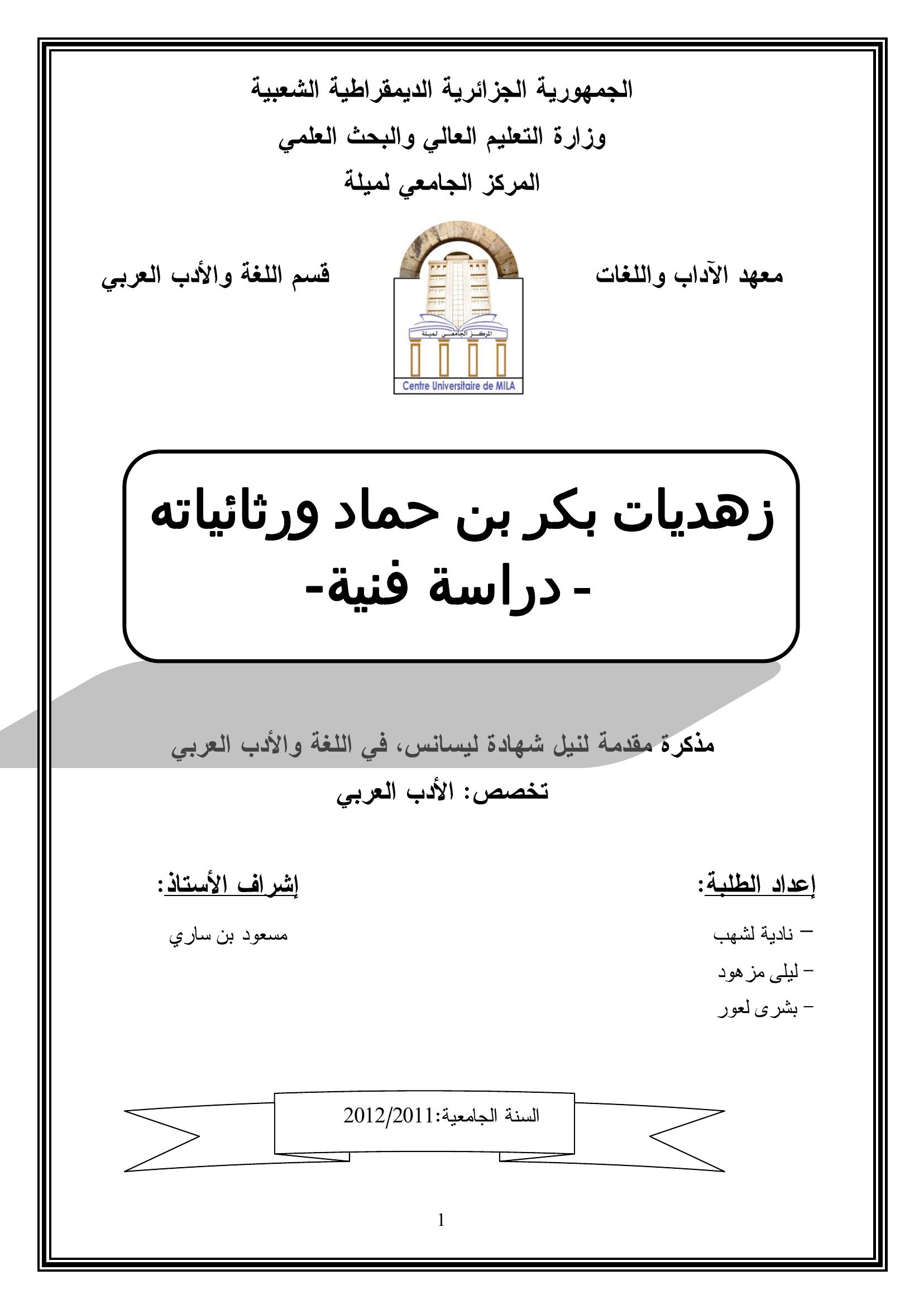 نادية لشهب et al. (2012). زهديات بكر بن حماد ورثائياته -دراسة فنية.
