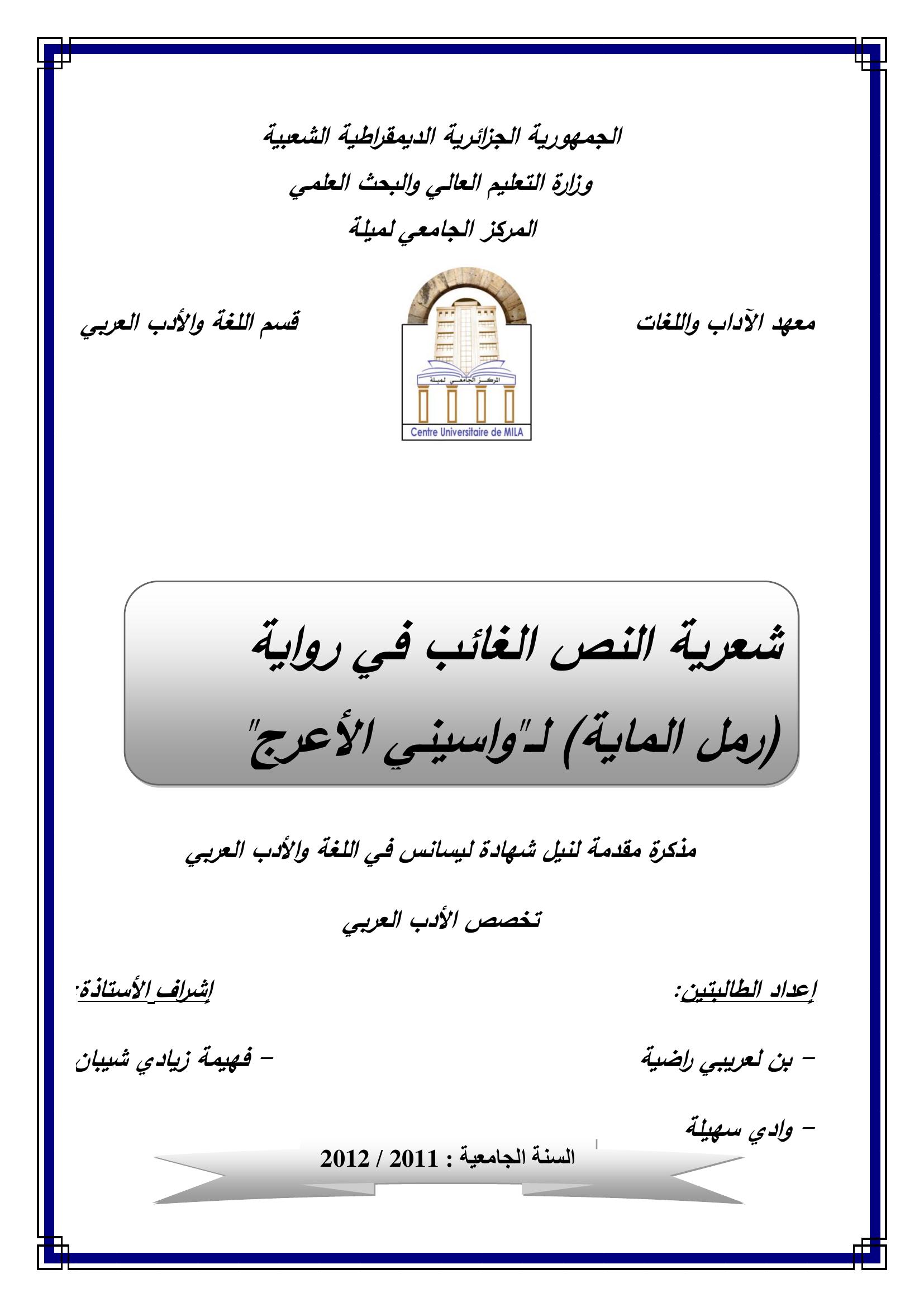 بن لعريبي راضية et al. (2012). شعرية النص الغائب في وراية (رمل الماية ) لـ''واسيني الأعرج ''.