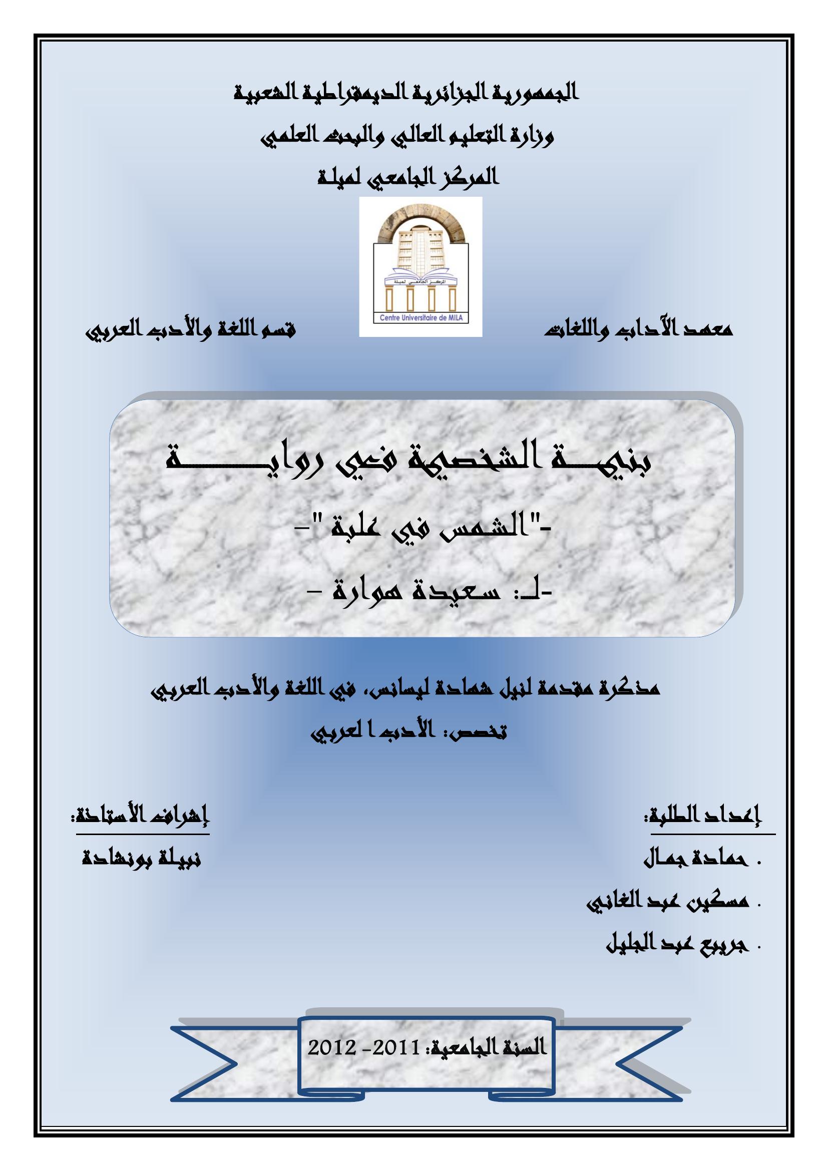 حمادة جمال et al. (2012). بنية الشخصية في رواية-''الشمس في علبة''-لـ:سعيدة هوارة-.