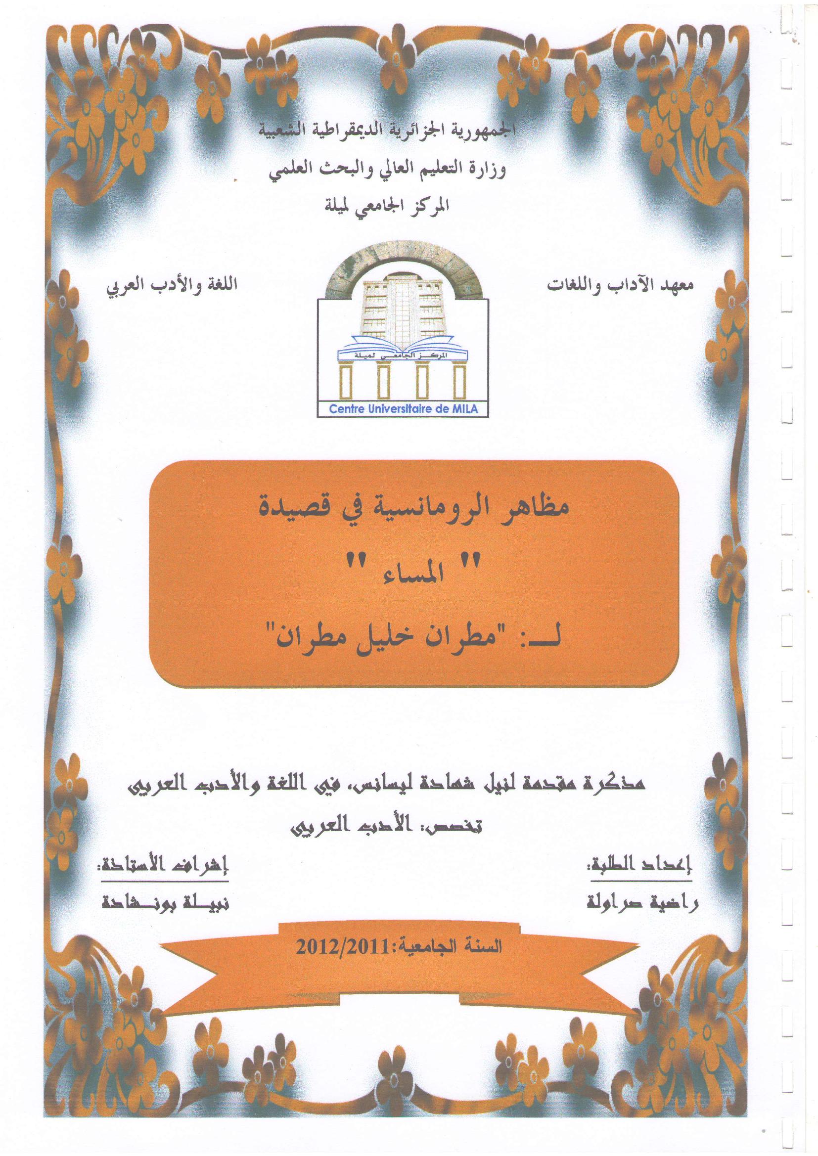 راضية صراولة & بونشادة نبيلة (مشرفا) (2012). مظاهر الرومانسية في قصيدة ''المساء''لـ'':مطران خليل مطران ''.