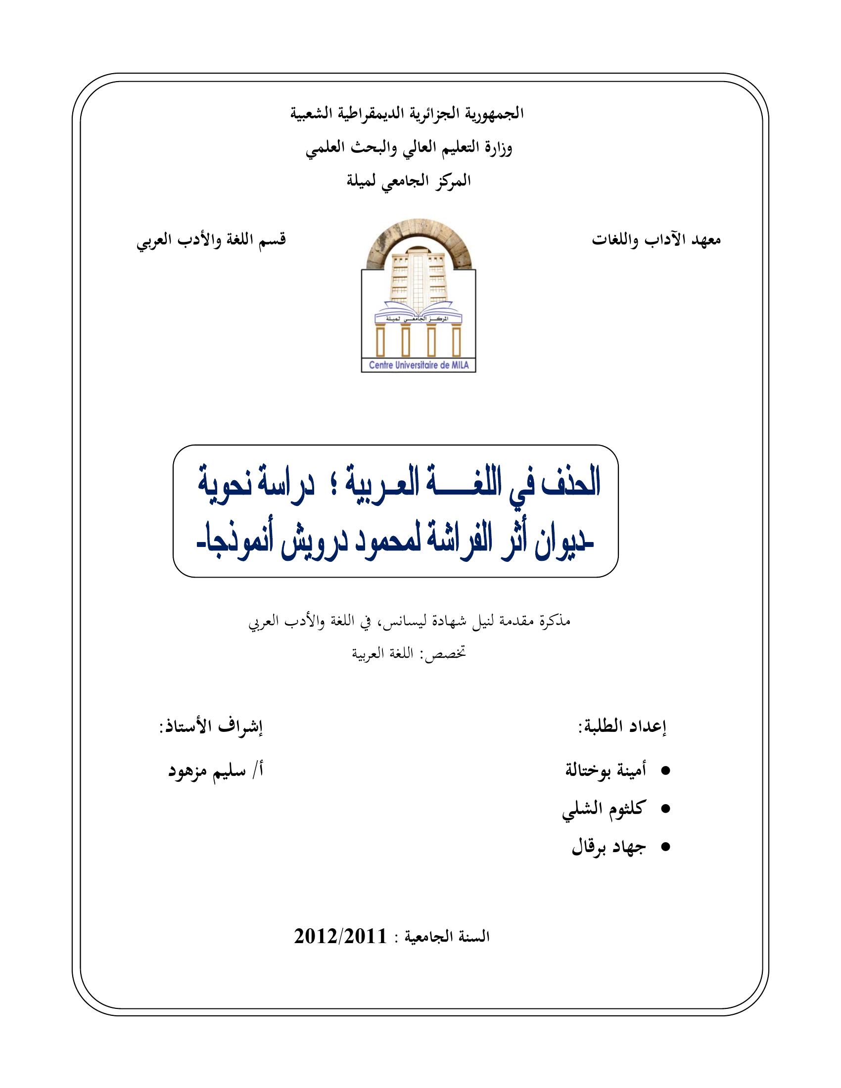 أمينة بوختالة et al. (2012). الحذف في اللغة العربية : دراسة نحوية -ديوان أثر الفراشة لمحمود درويش أنمودجا-.