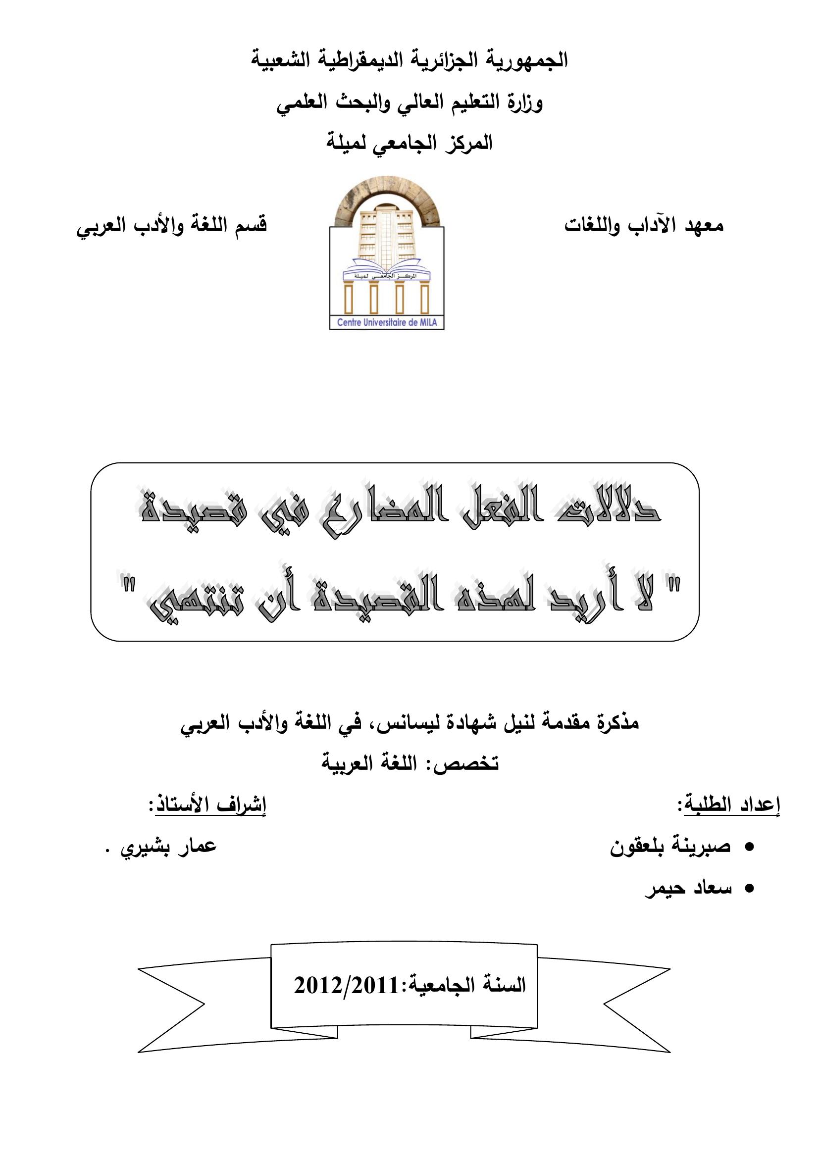 صبرينة بلعقون et al. (2012). دلالات الفعل المضارع في قصيدة "لا أريد لهده القصيدة أن تنتهي".