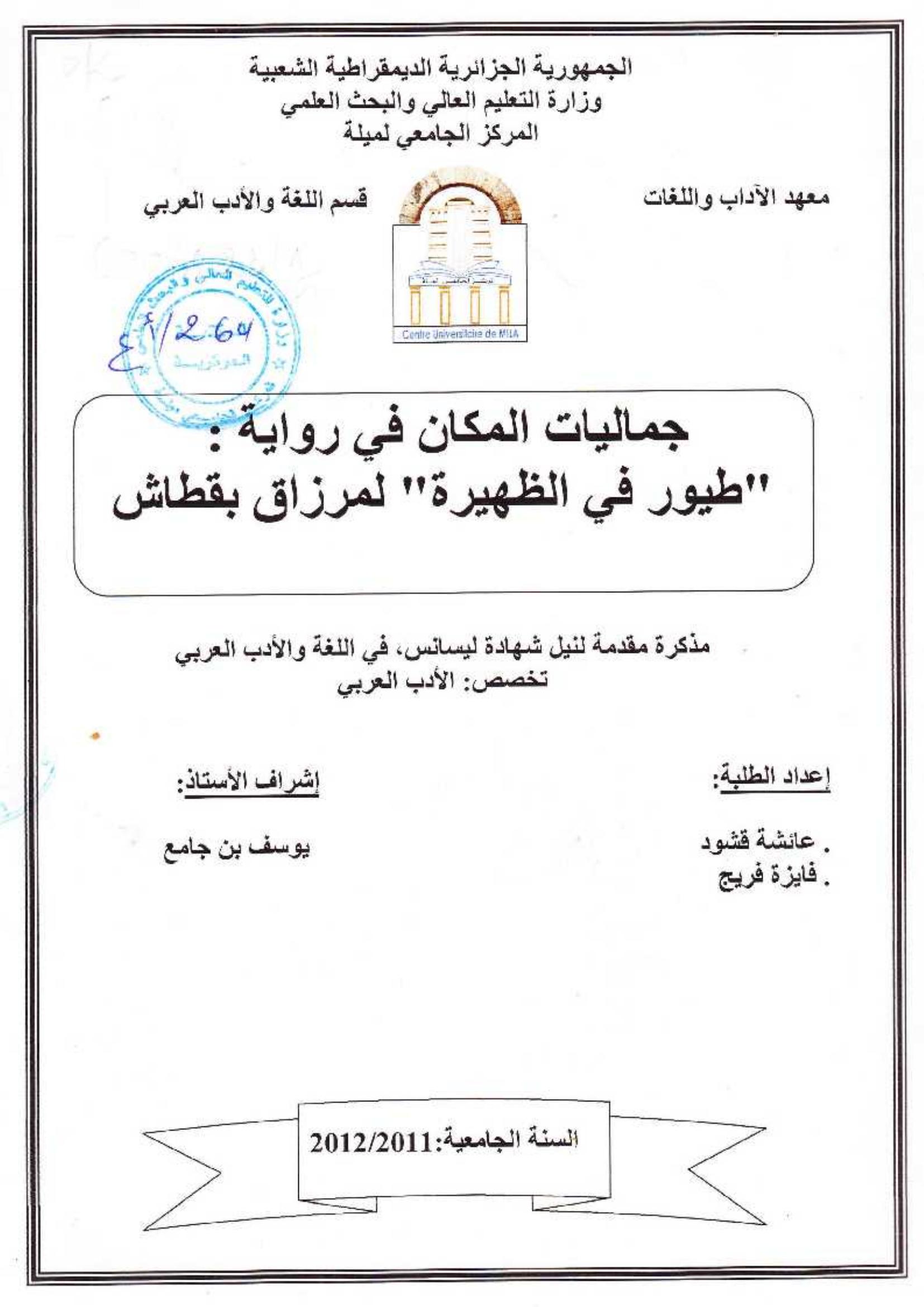 عائشة قشود et al. (2012). جماليات المكان في رواية :''طيور في الظهيرة ''لمرزاق بقطاش.