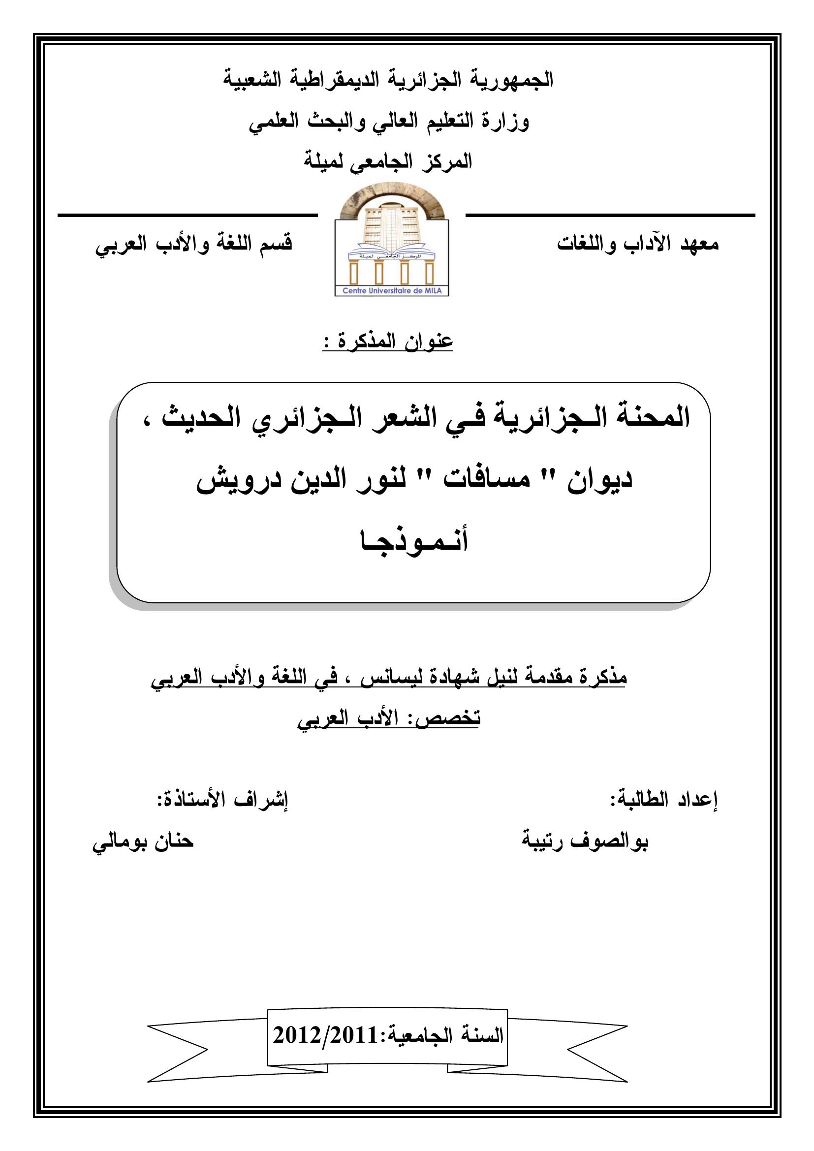 بوالصوف رتيبة & بومالي حنان (2012). المحنة الجزائرية في الشعر الجزائري الحديث ديوان''مسافات ''لنورالدين درويش أنمودجا.