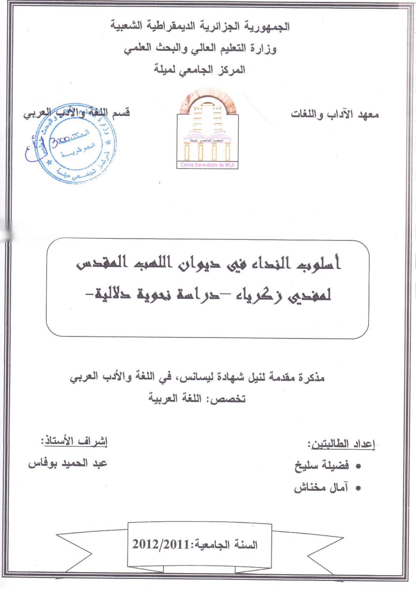 فضيلة سليخ et al. (2012). أسلوب النداء في ديوان اللهب المقدس لمفدي زكرياء -دراسة نحوية دلالية.