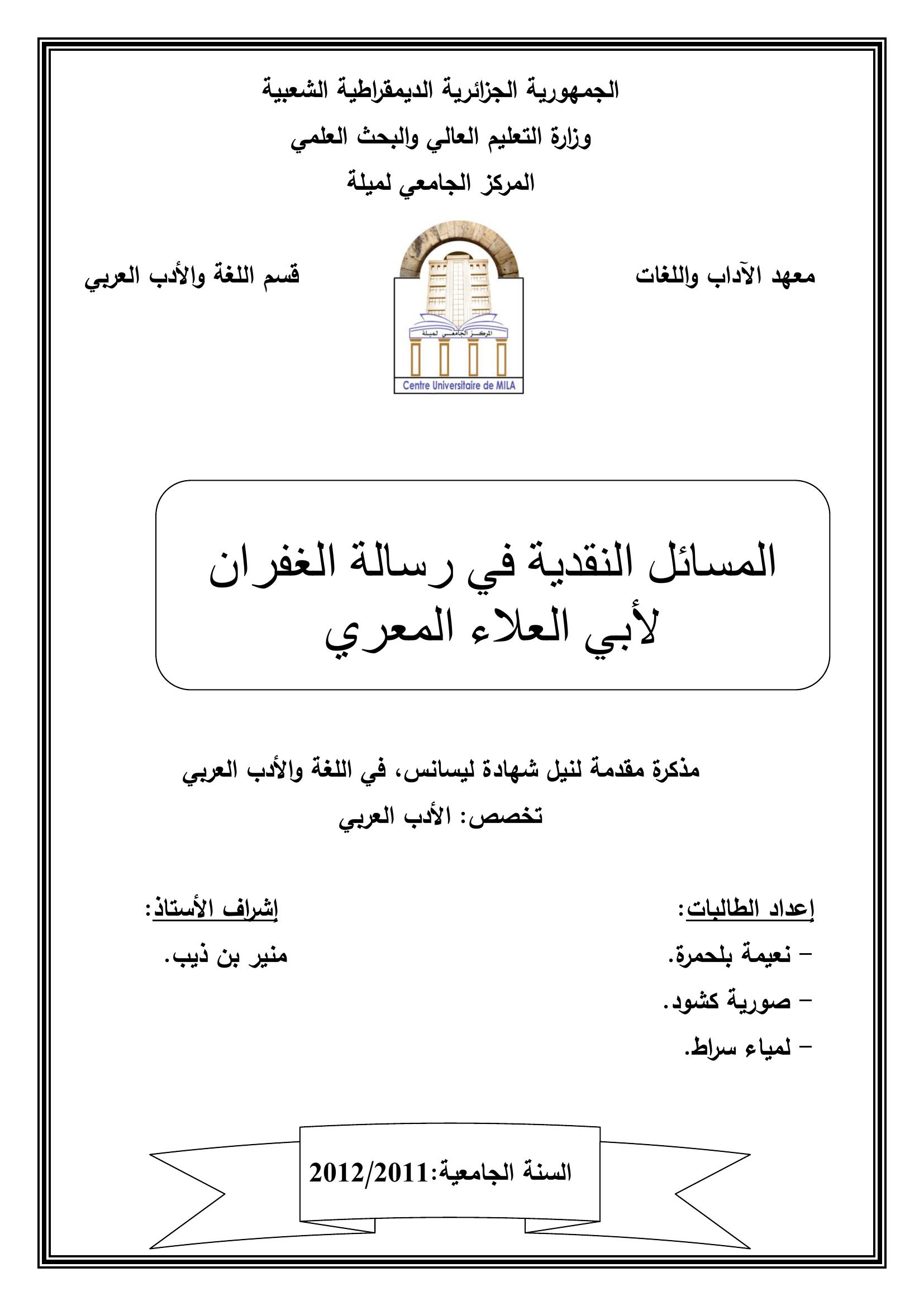 نعيمة بلحمرة et al. (2012). المسائل النقدية في رسالة الغفران لأبي العلاء المعري.