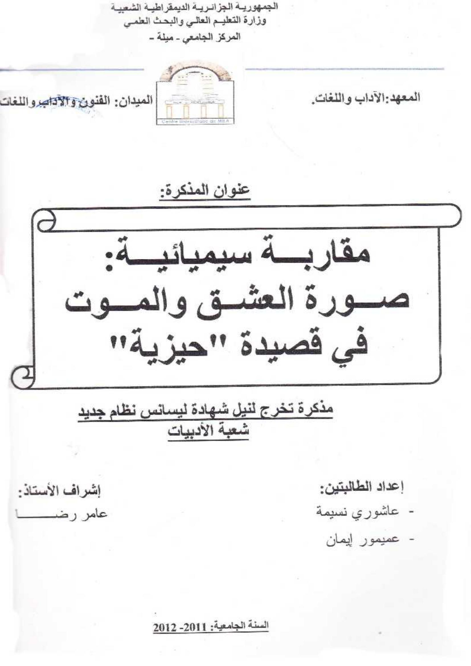 عاشوري نسيمة et al. (2012). مقاربة سيميائية:صورة العشق و الموت في قصيدة ''حيزية ''.