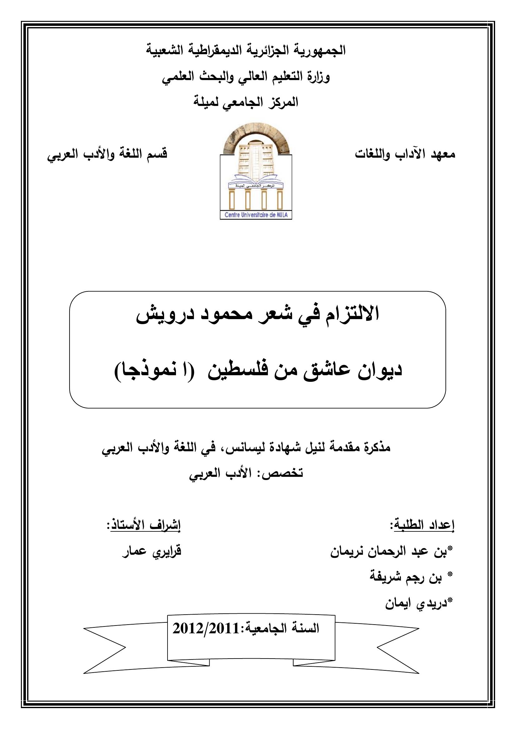 بن عبد الرحمان نريمان et al. (2012). الالتزام في شعر محمود درويش ديوان عاشق من فلسطين (أنمودجا).