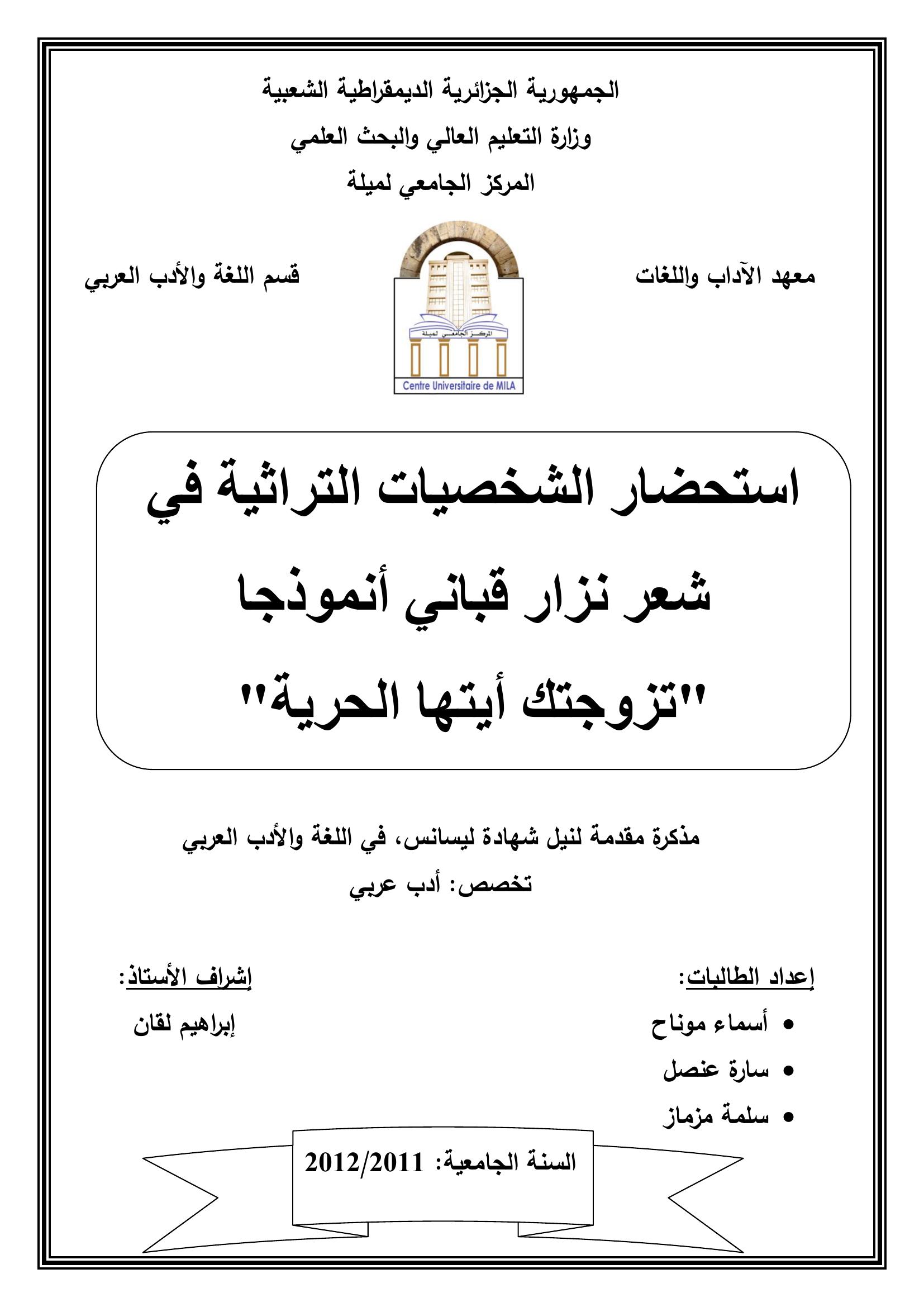أسماء موناح et al. (2012). استحضار الشخصيات التراثية في شعر نزار قباني نمودجا''تزوجتك أيتها الحرية''.