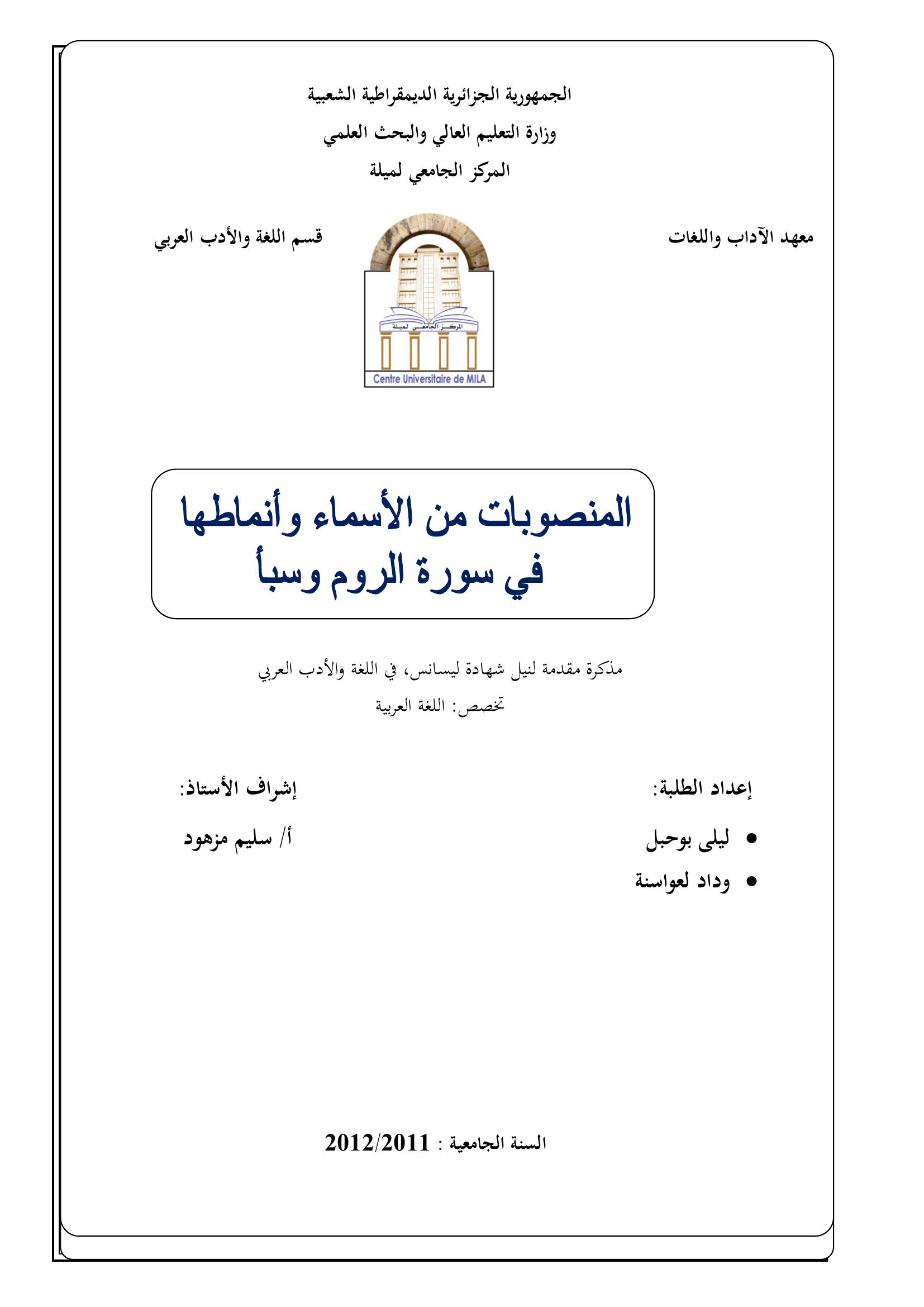 ليلى بوحبل et al. (2012). المنصوبات من الأسماء و أنماطها في سورة الروم وسبأ.