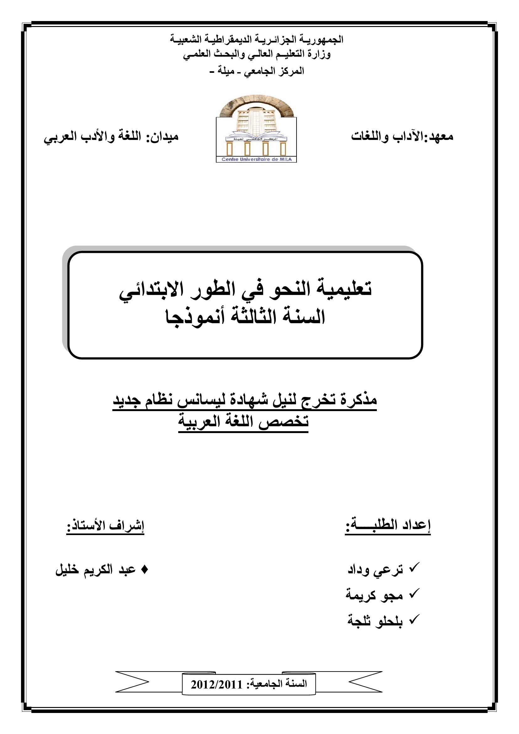 ترعي وداد et al. (2012). تعليمية النحو في الطور الإبتدائي السنة الثالثة نمودجا.