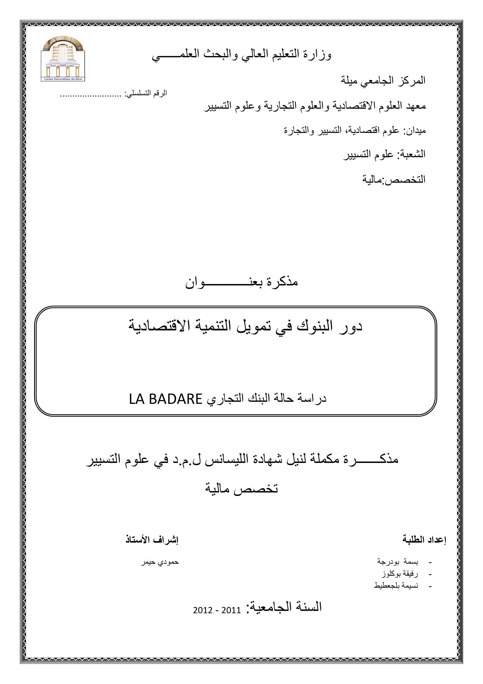 بسمة بودرجة & حيمر حمودي (مشرفا) (2012). دور البنوك في تمويل التنمية الإقتصادية دراسة حالة بنك الفلاحة والتنمية الريفية ''badr''.