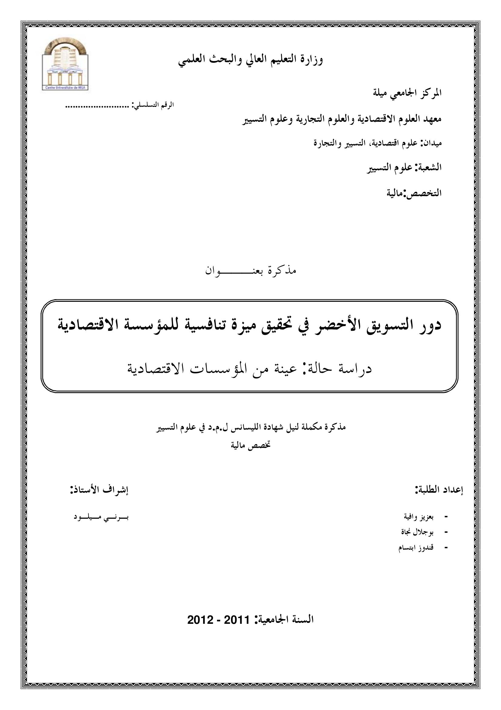 بعزيز وافية & برني ميلود (مشرفا) (2012). دور التسويق الاخضر في تحقيق ميزة تنافسية للمؤسسة الاقتصادية دراسة حالة :عينة من المؤسسة الاقتصادية.