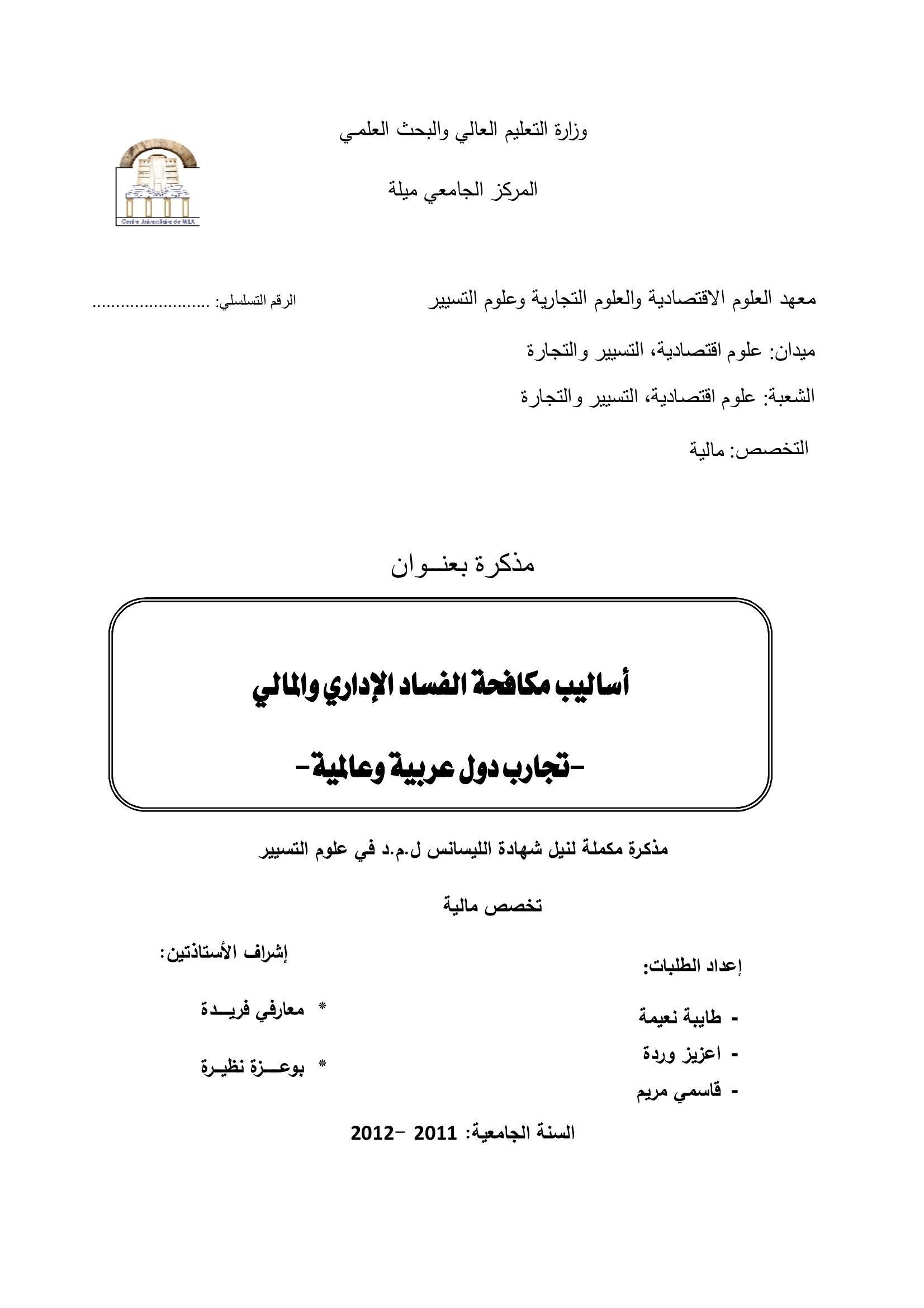 طايبة نعيمة et al. (2012). أساليب مكافحة الفساد الإداري والمالي -تجارب دول عربية وعالمية -.
