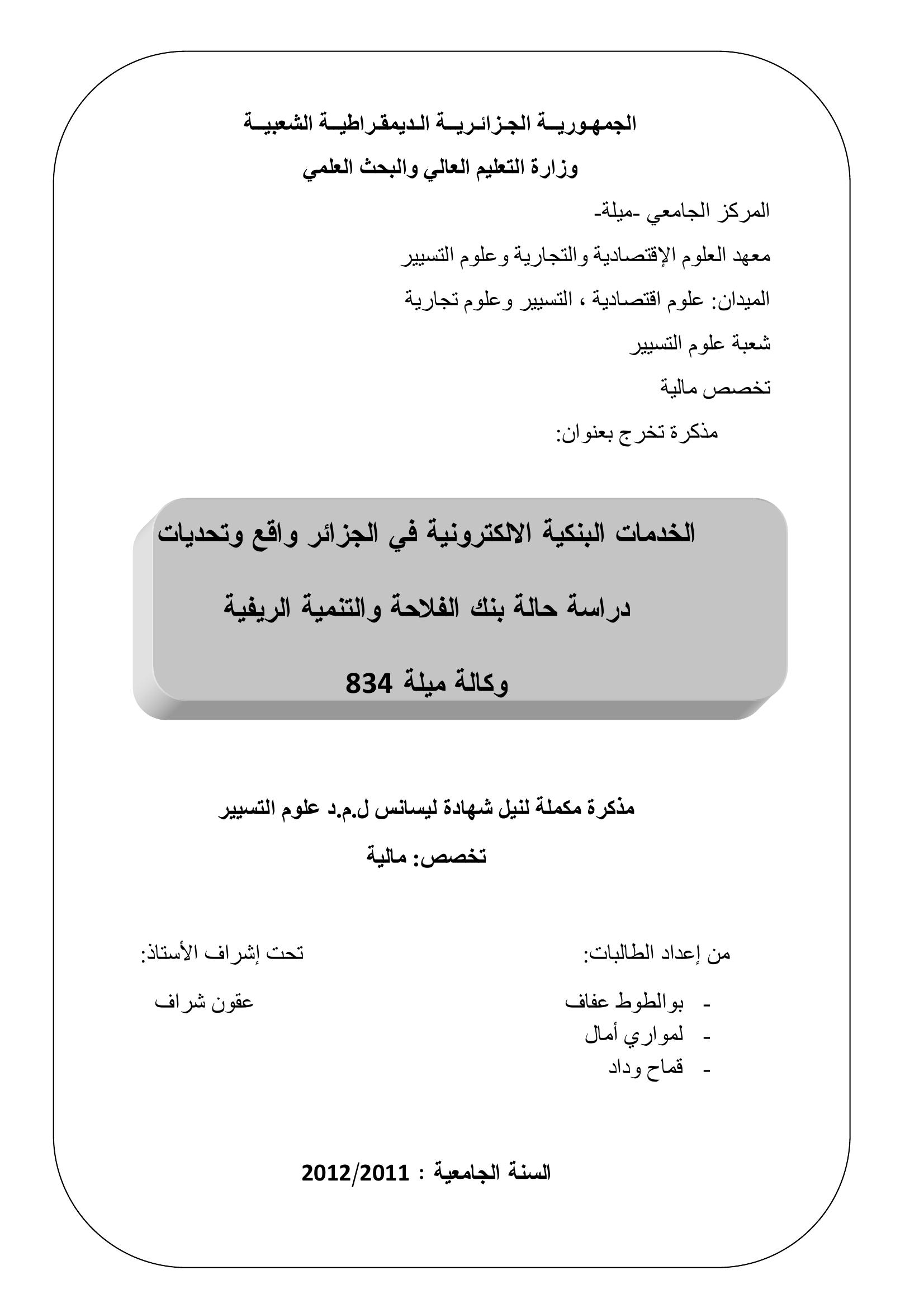 بوالطوط عفاف & عقون شراف(مشرفا) (2012). الخدمات البنكية الالكترونية في الجزائر واقع وتحديات دراسة حالة.