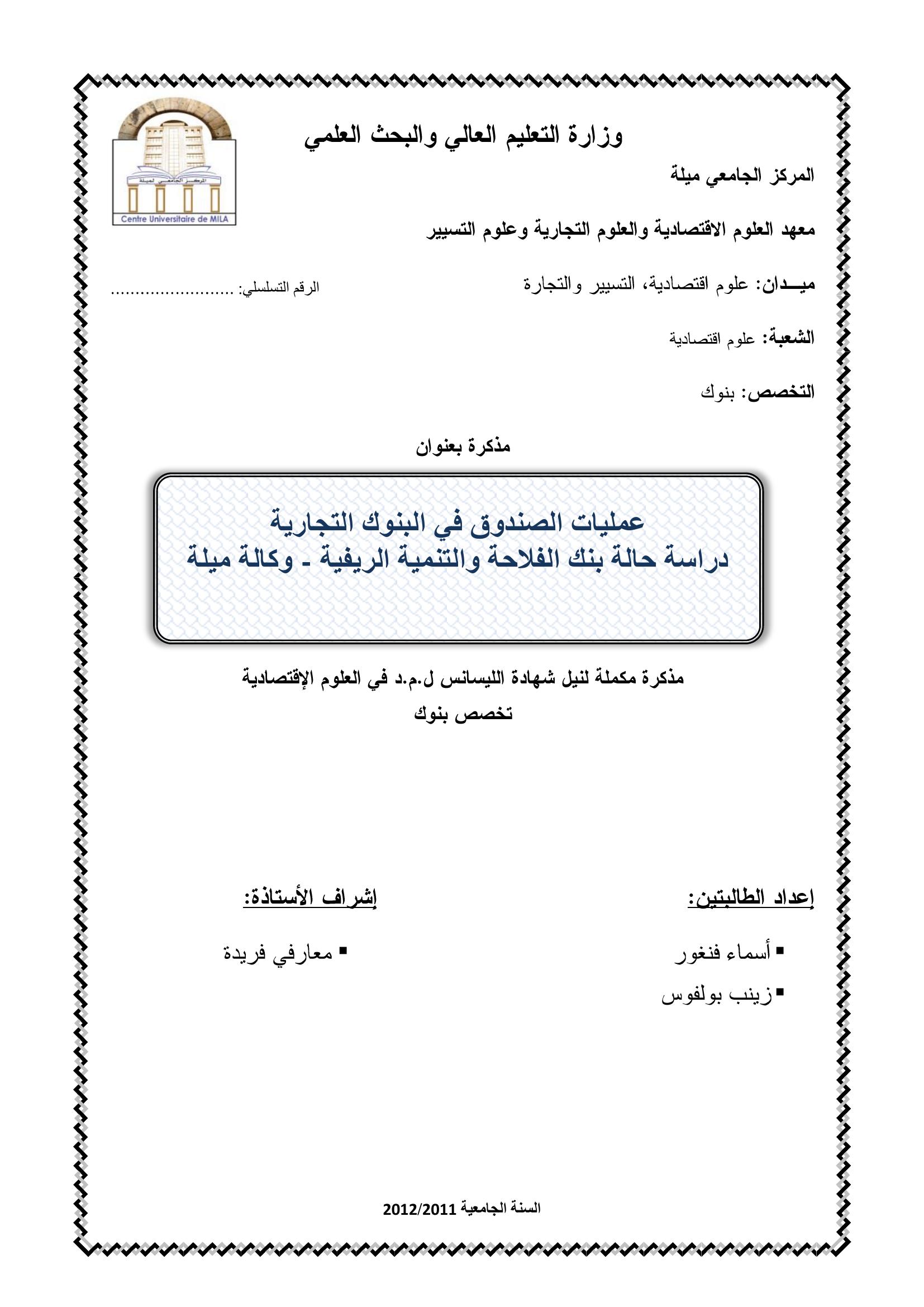 أسماء فنغور & معارفي فريدة(مشرفا) (2012). عمليات الصندوق في البنوك التجارية دراسة حالة بنك الفلاحة والتنمية الريفية- وكالة ميلة -.