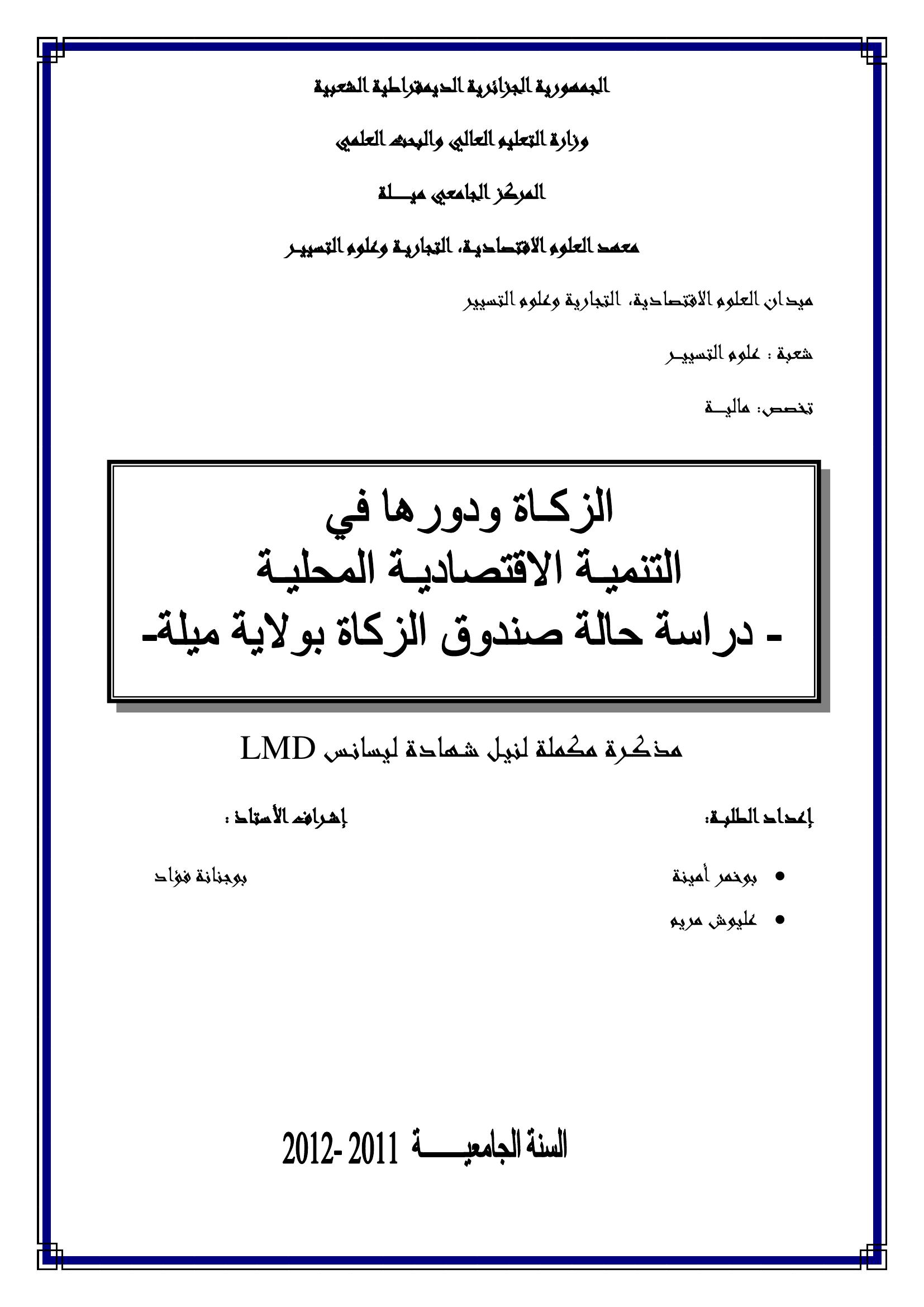بوخمر أمينة & بوجنانة فؤاد (مشرفا) (2012). الزكاة و دورها في التنمية الإقتصادية المحلية دراسة حالة : صندوق الزكاة بولاية ميلة.
