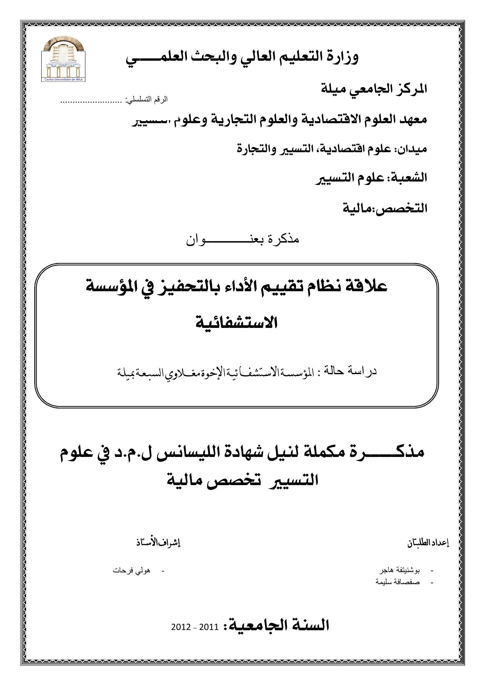 علاقة نظام تقييم الأداء بالتحفيز في المؤسسة الإستشفائية الإخوة مغلاوي السبعة - بميلة -