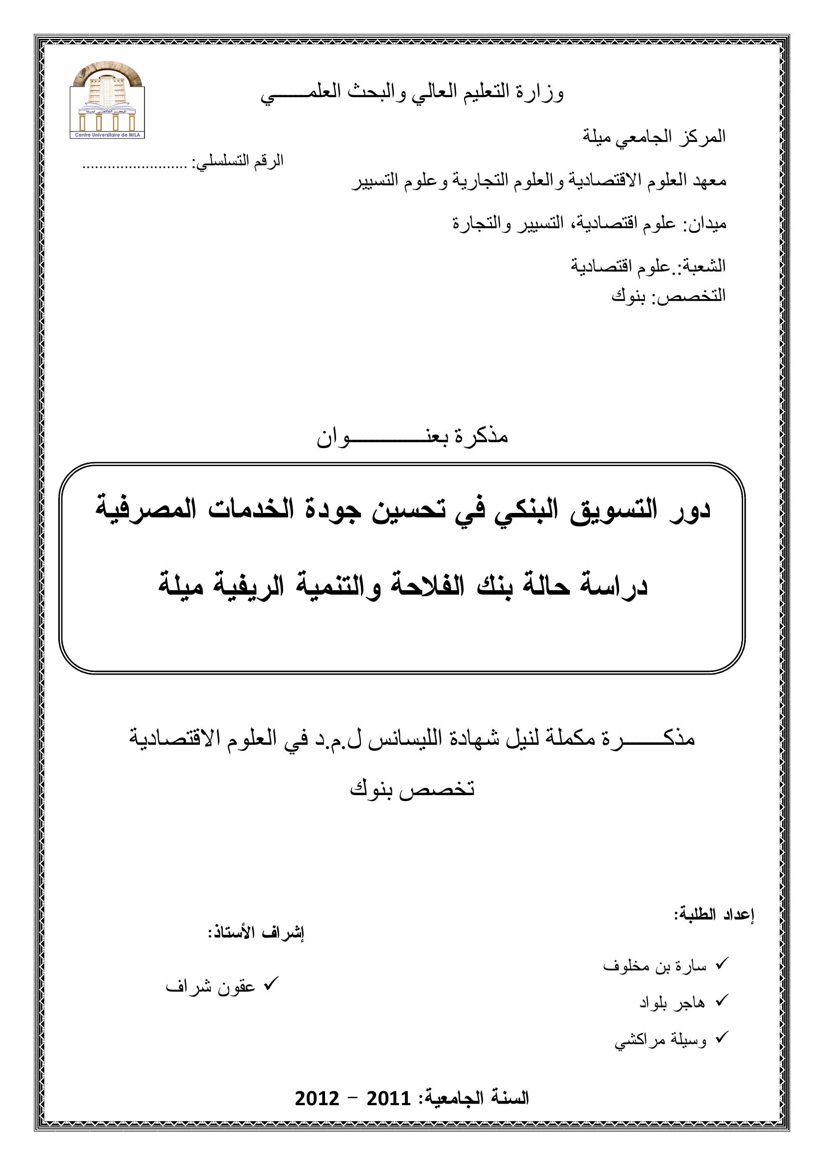 سارة بن مخلوف & عقون شراف(مشرفا) (2012). دور التسويق البنكي في تحسين جودة الخدمات المصرفية دراسة حالة بنك الفلاحة والتنمية الريفية - ميلة -.