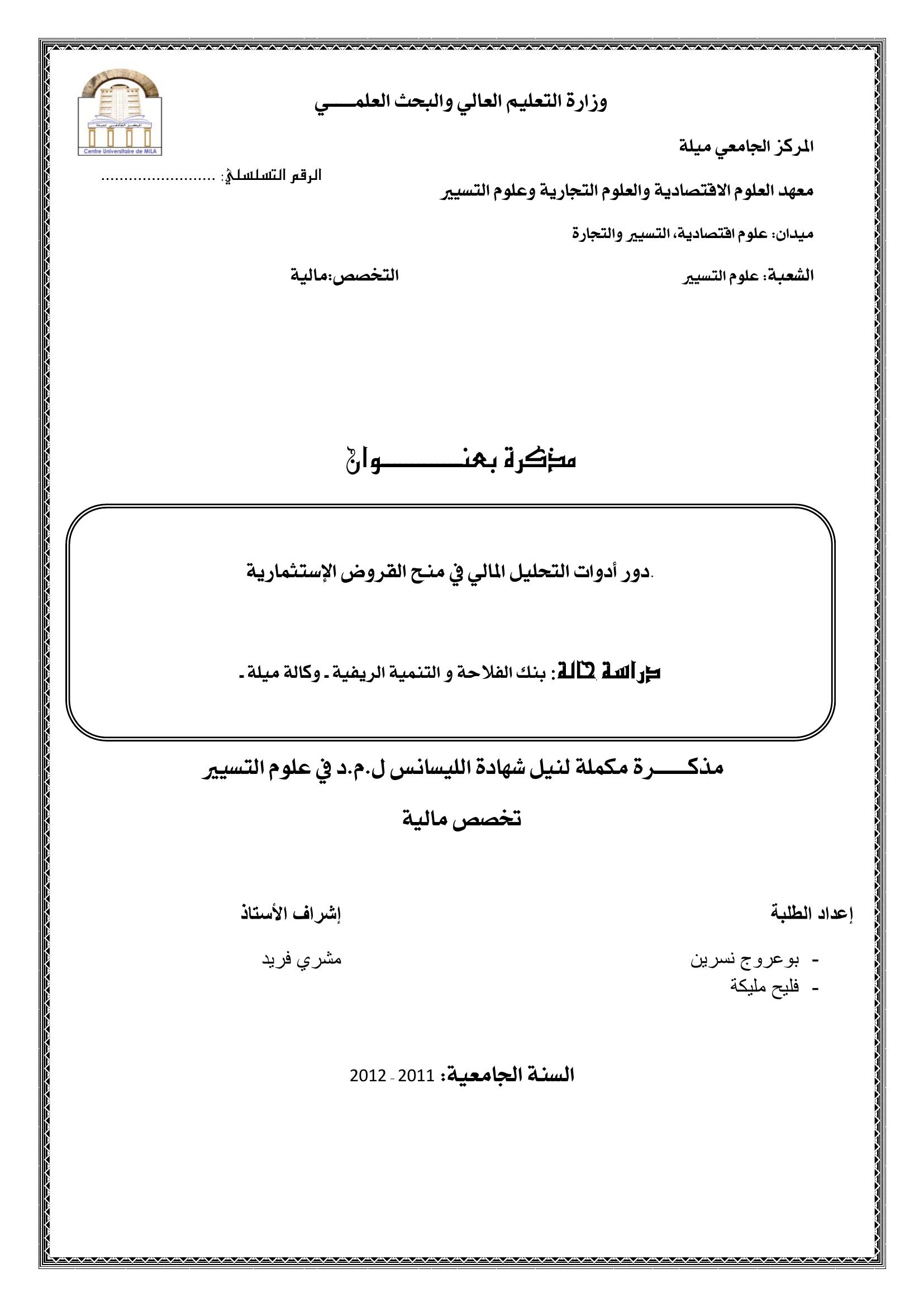 بوعروج نسرين & مشري فريد(مشرفا) (2012). دور أدوات التحليل المالي في منح القروض الإستثمارية دراسة حالة بنك الفلاحة والتنمية الريفية وكالة ميلة -.
