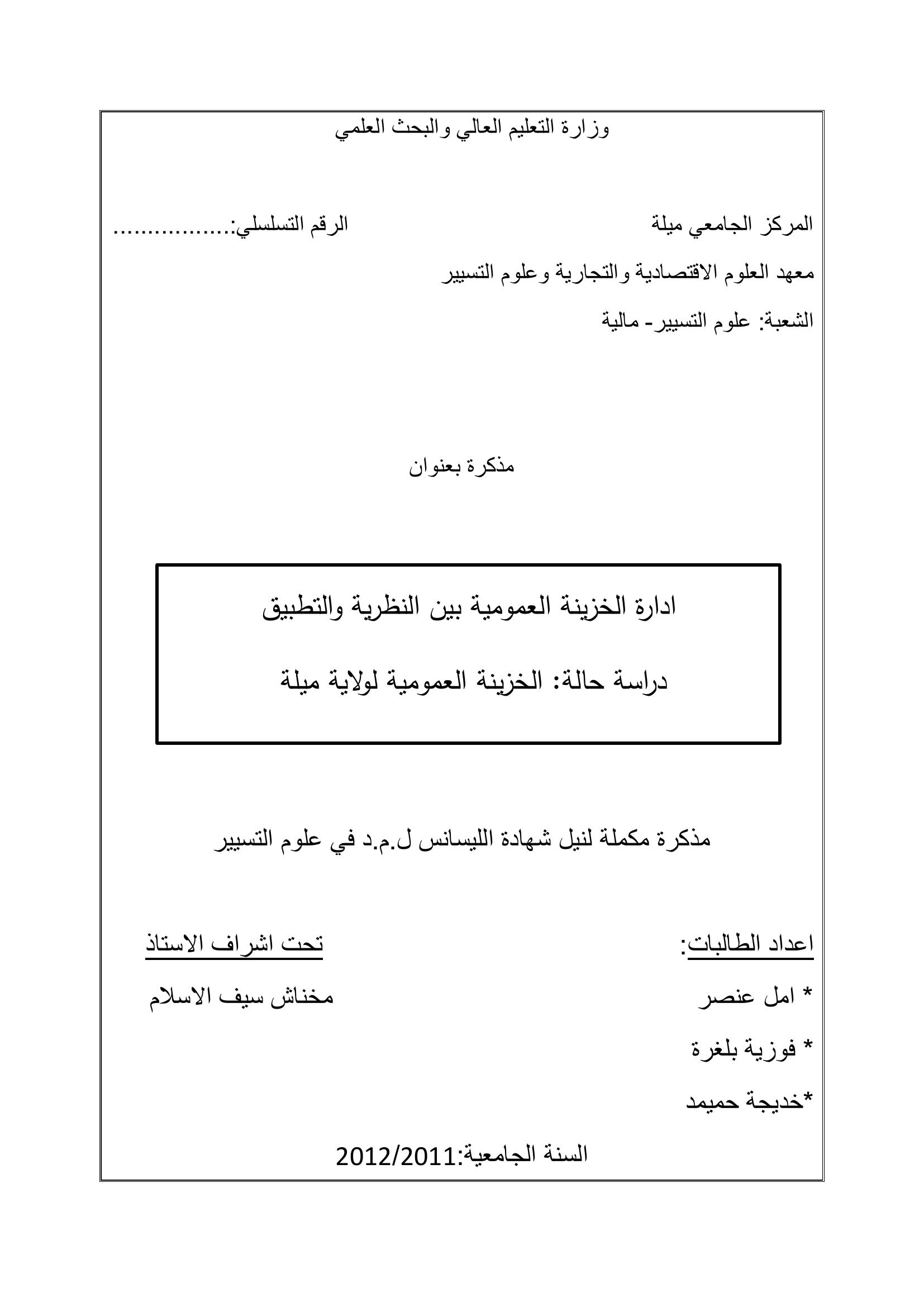 امل عنصر & محبوب فاطمة (مشرفا) (2012). ادارة الخزينة العمومية بين النظرية والتطبيق : دراسة حالة : الخزينة العمومية لولاية ميلة.