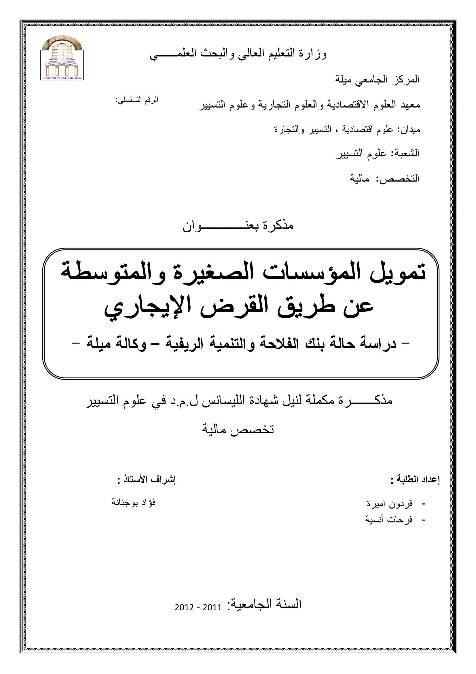 قردون اميرة & بوجنانة فؤاد (مشرفا) (2012). تمويل المؤسسات الصغيرة والمتوسطة عن طريق القرض الإيجاري دراسة حالة ينك الفلاحة والتنمية الريفية -وكالة ميلة -.