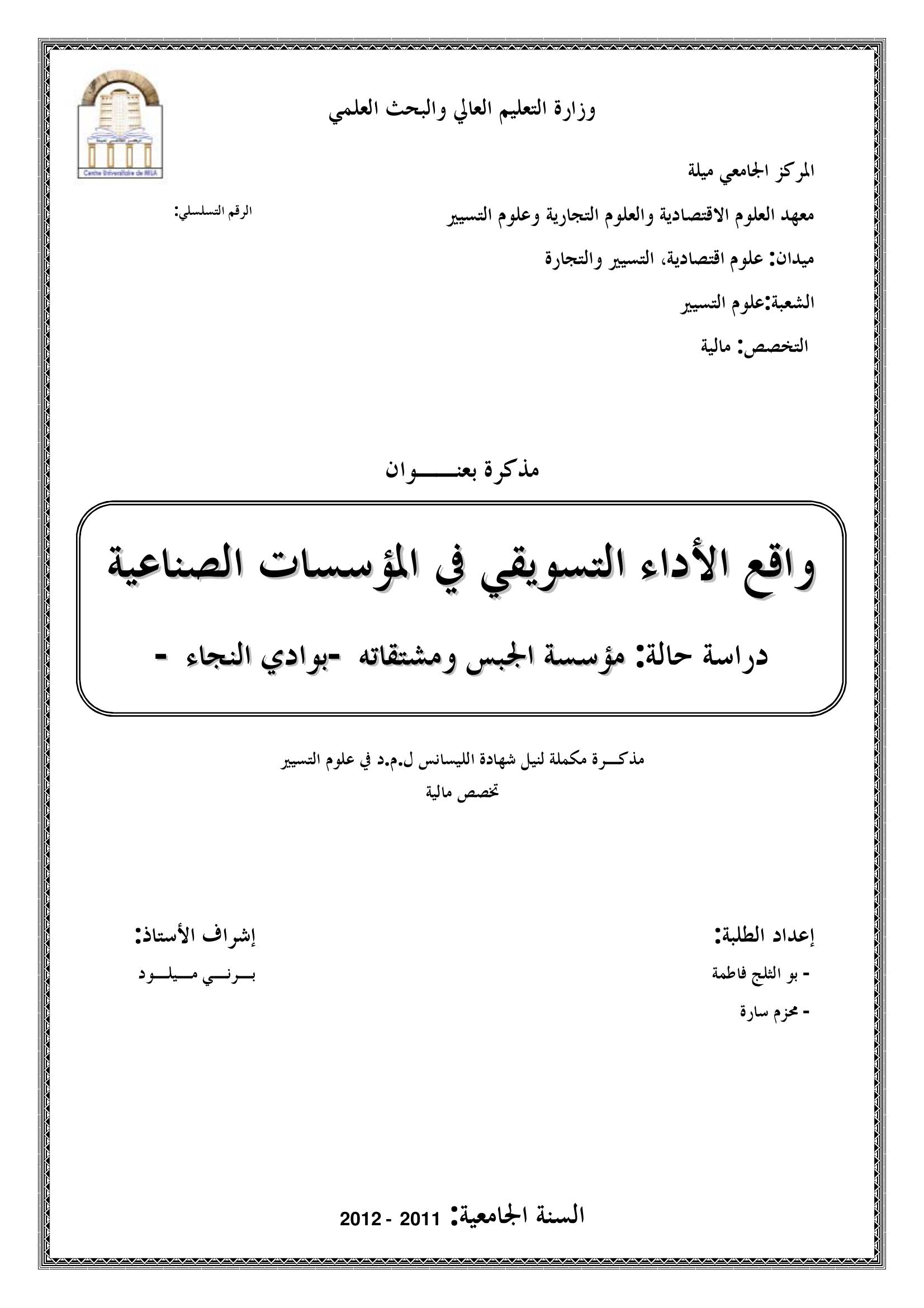 بوالثلج فاطمة & برني ميلود (مشرفا) (2012). واقع الأداء التسويقي في المؤسسات الصناعية دراسة حالة مؤسسة الجبس ومشتقاته - بوادي النجاء -.