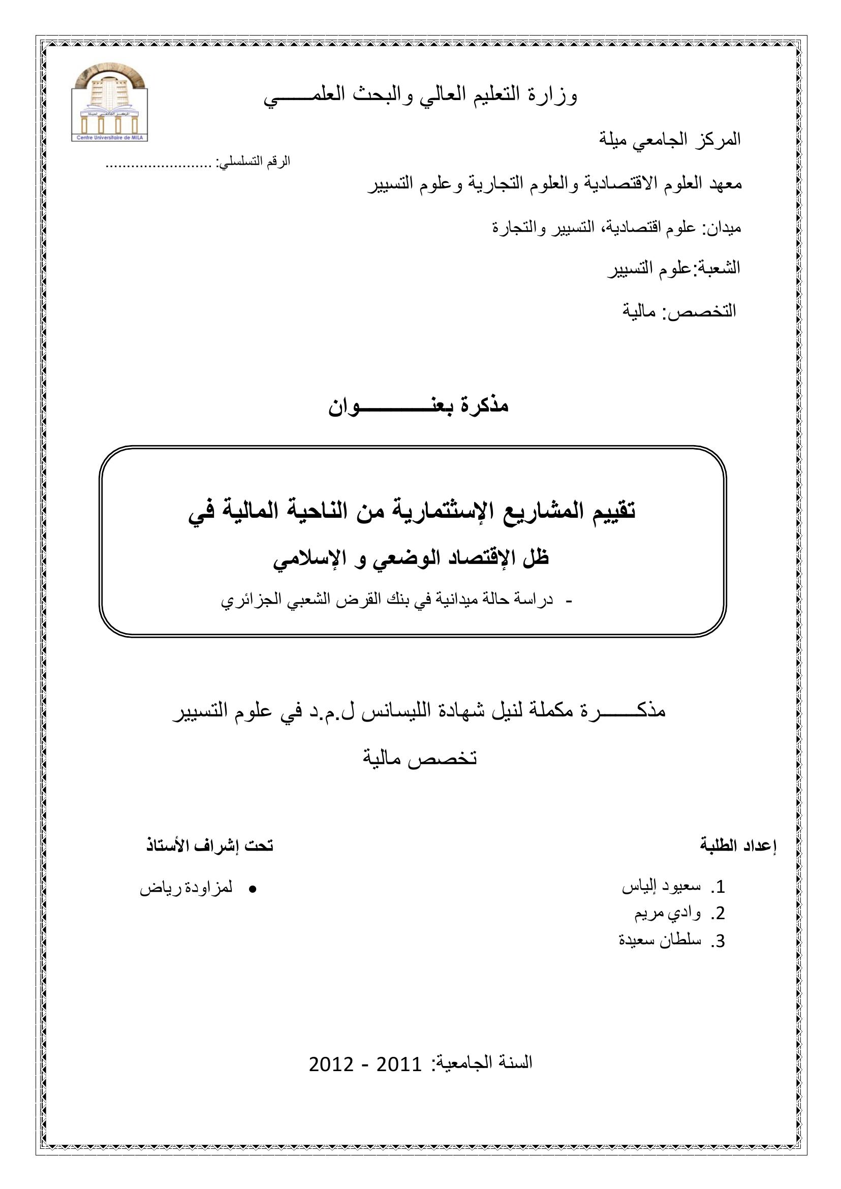 وادي مريم & لمزاودة رياض (مشرفا) (2012). تقييم المشاريع الاستثمارية من الناحية المالية في ظل الاقتصاد الوضعي و الاسلامي دراسة حالة ميدانية في بنك القرض الشعبي.