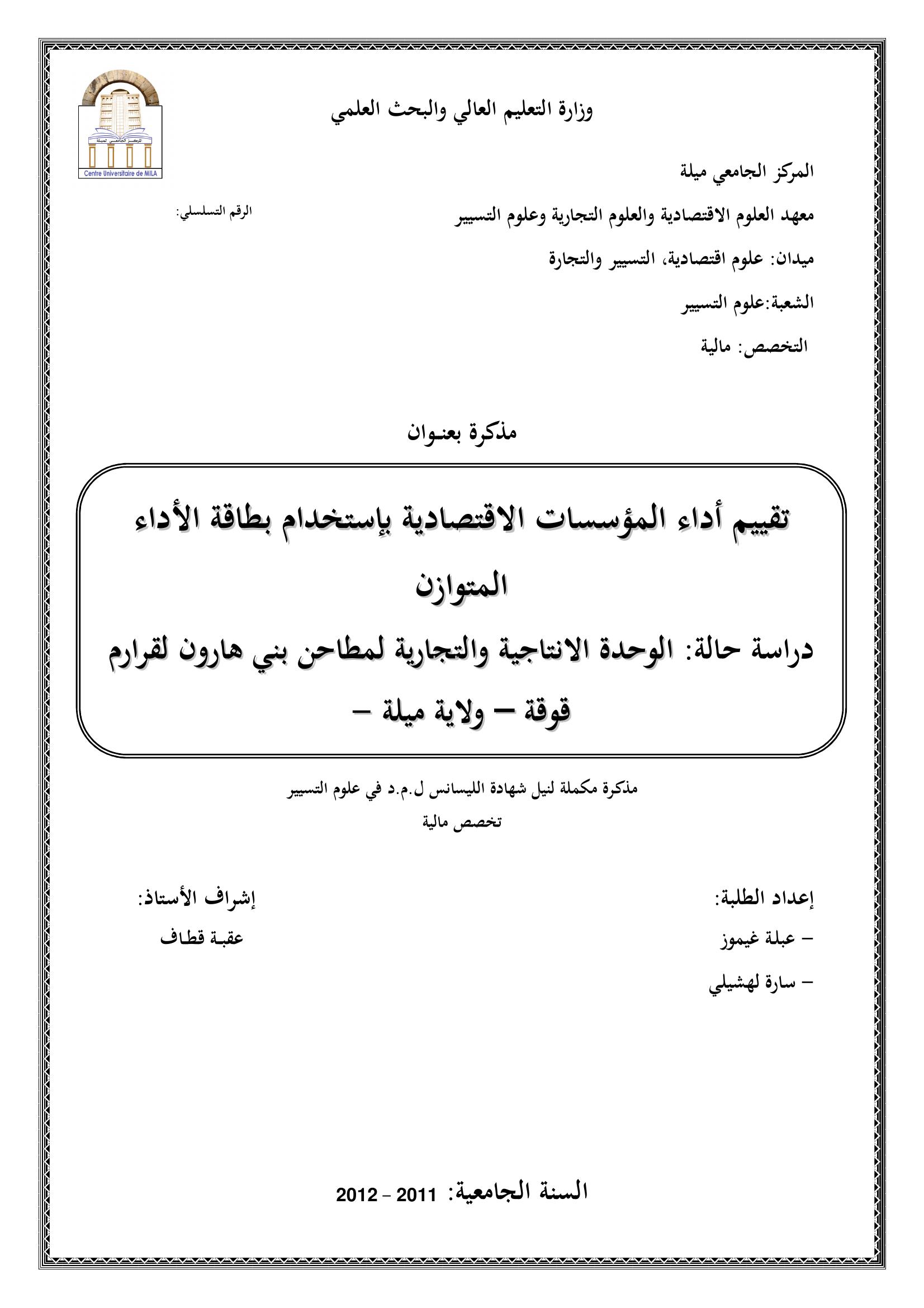غيموز عبلة & قطاف عقبة(مشرفا) (2012). تقييم أداء المؤسسات الإقتصادية باستخدام بطاقة الأداء المتوازن دراسة حالة.