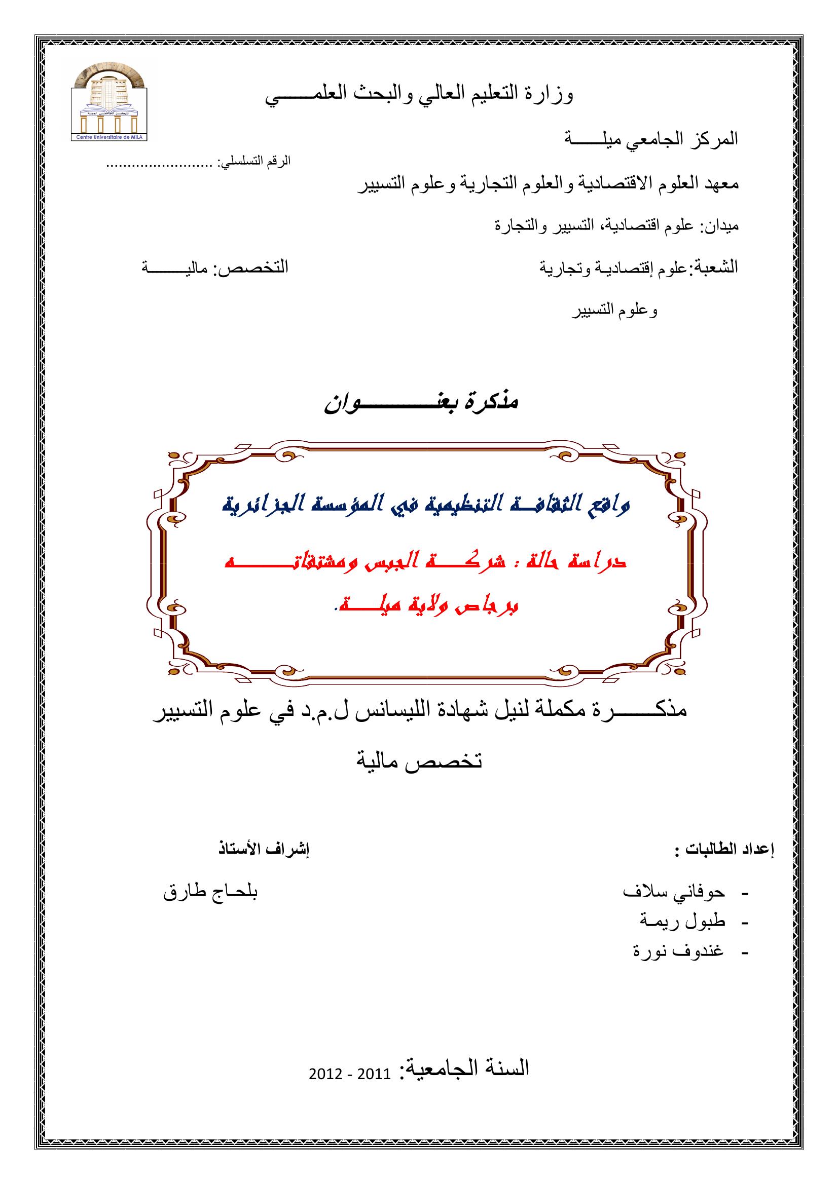 حوفاني سلاف & ،بلحاج طارق(رئيسا)، لطرش جمال(مناقشا)، غيش عبد العالي(مشرفا ومقررا) (2012). واقع الثقافة التنظيمية في المؤسسة الجزائرية دراسة حالة شركة الجبس ومشتقاته برجاص - ولاية ميلة.