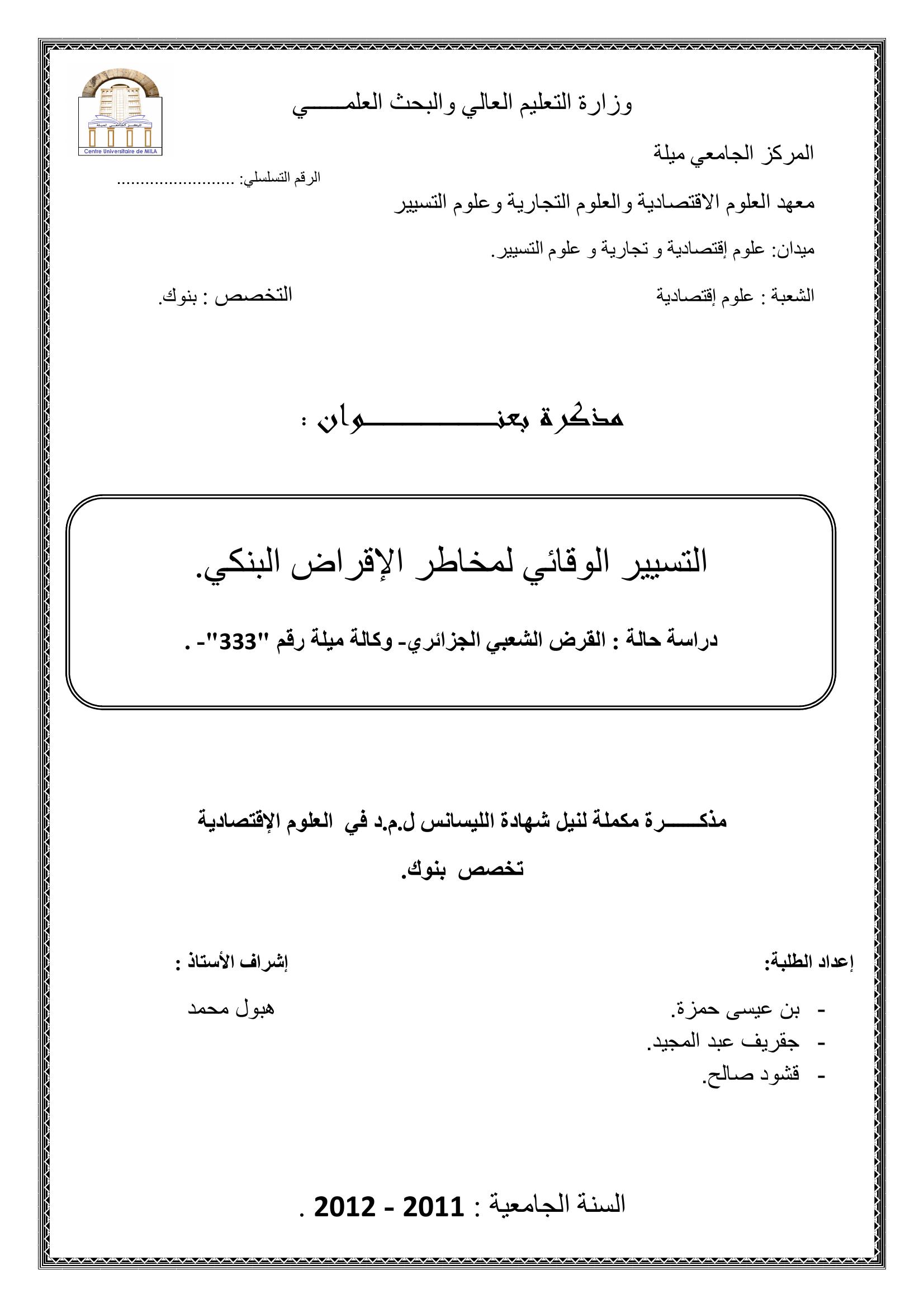 بن عيسى حمزة & هبول محمد(مشرفا) (2012). التسيير الوقائي لمخاطر الإقراض البنكي ..