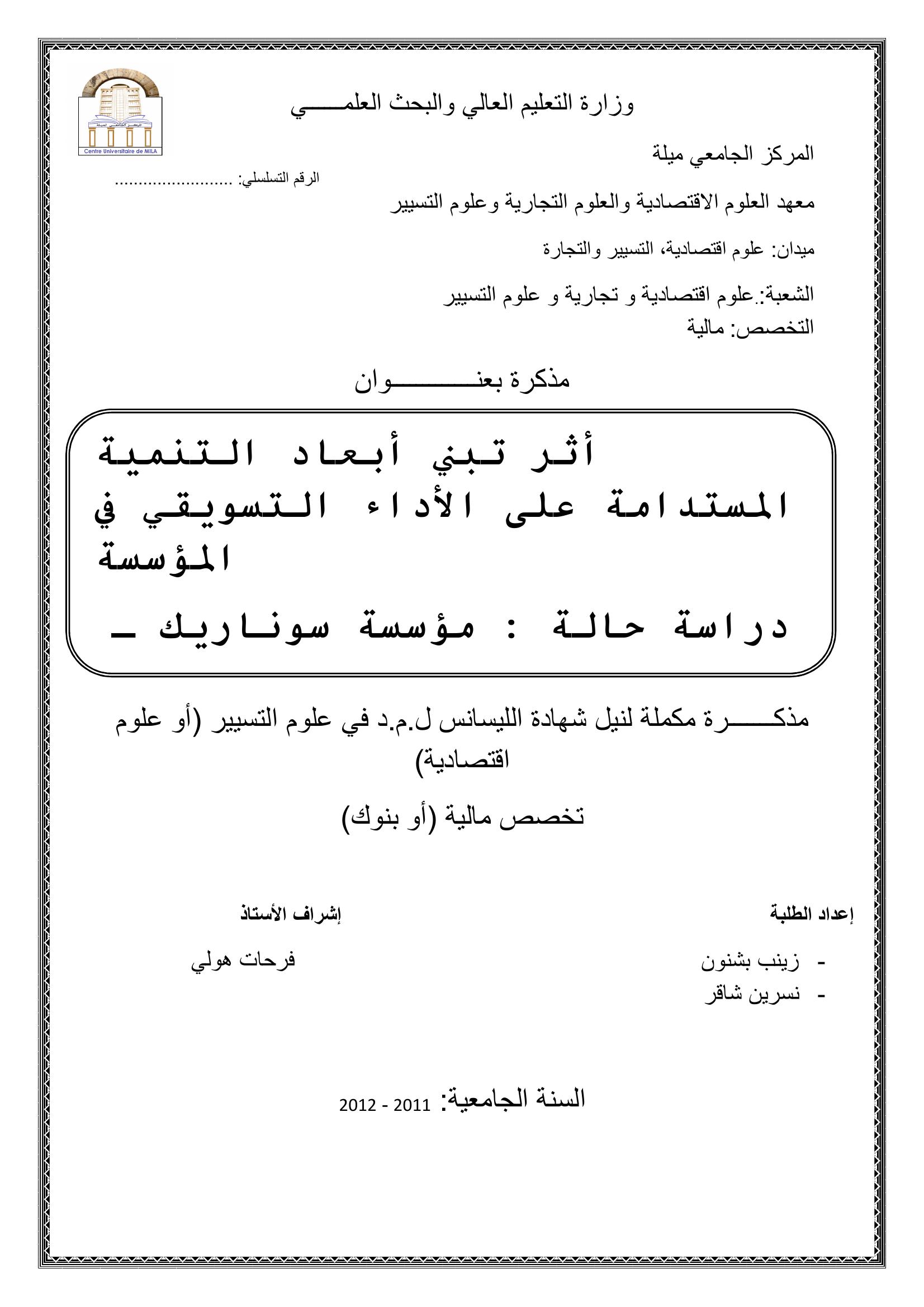 زينب بشنون & هولي فرحات (مشرفا) (2012). أثر تبني أبعاد التنمية المستدامة على الأداء التسويقي في المؤسسة.