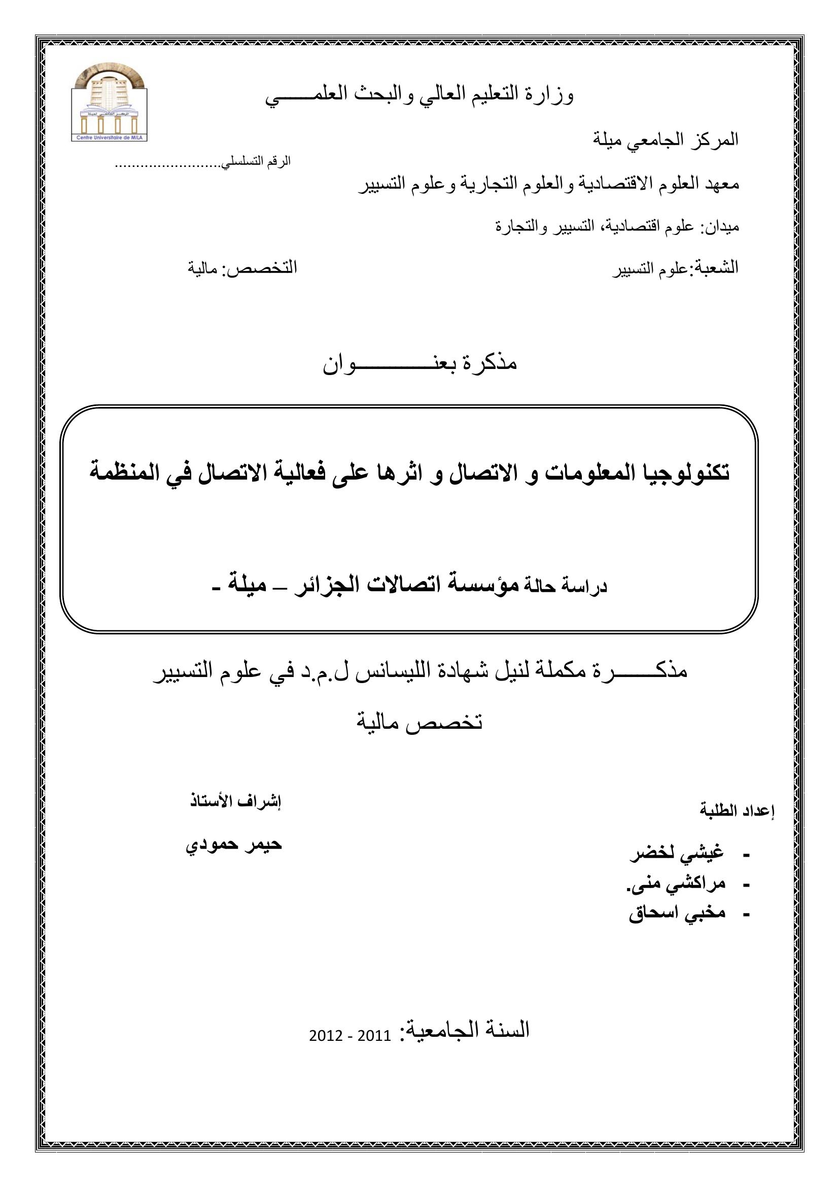 حيمر حمودي (مشرفا) & مخبي اسحاق (2012). تكنولوجيا المعلومات والاتصال واثرها على فعالية الاتصال في المنظمة دراسة حالة.