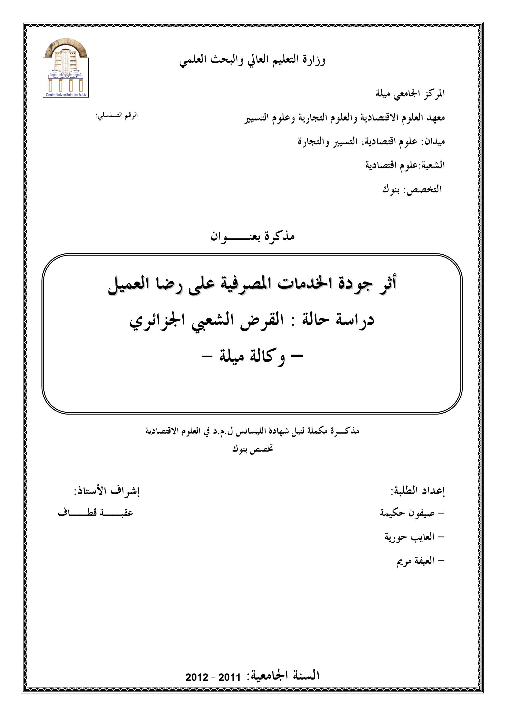 صيفون حكيمة & قطاف عقبة(مشرفا) (2012). أثر جودة الخدمات المصرفية على رضا العميل.