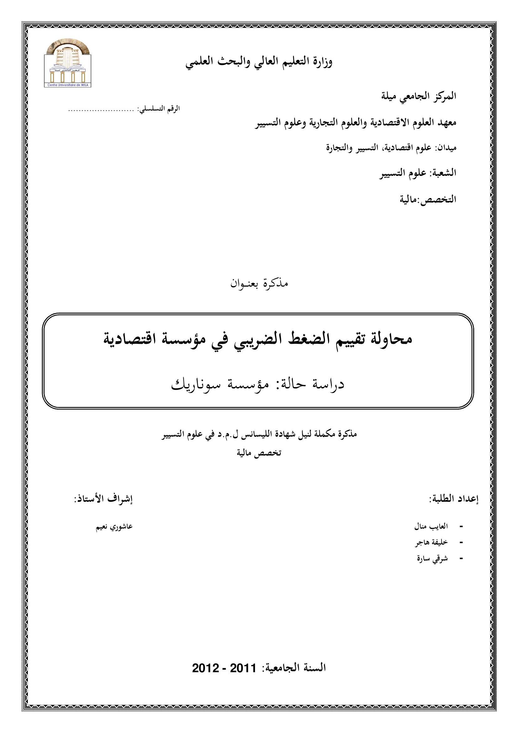 العايب منال & عاشوري نعيم (مشرفا) (2012). محاولة تقييم الضغط الضريبي في مؤ سسة اقتصادية : دراسة حالة : مؤسسة سوناريك.