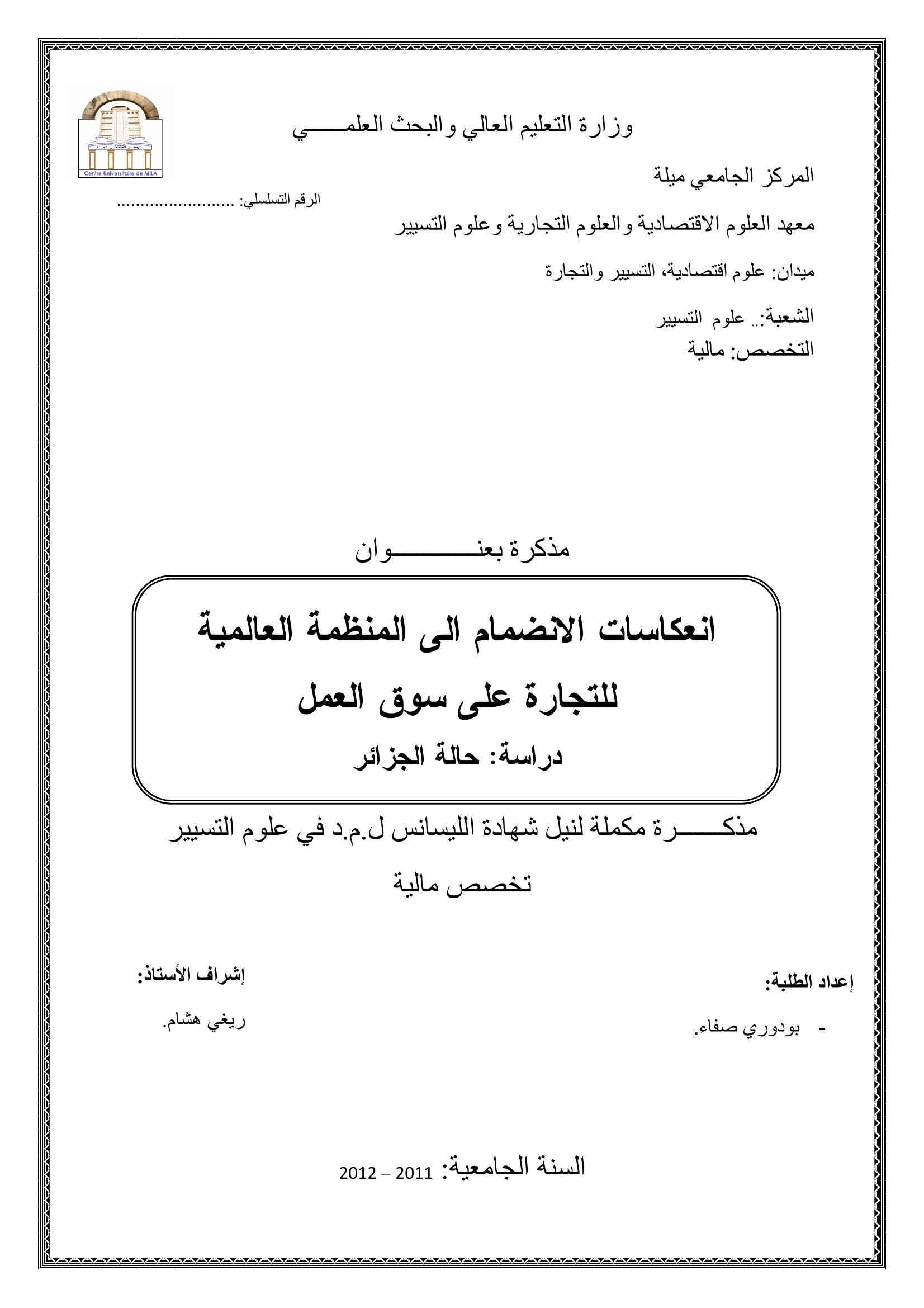 بودوري صفاء & ريغي هشام (مشرفا) (2012). انعكاسات الإنضمام إلى المنظمة العالمية للتجارة على سوق العمل دراسة حالة الجزائر.